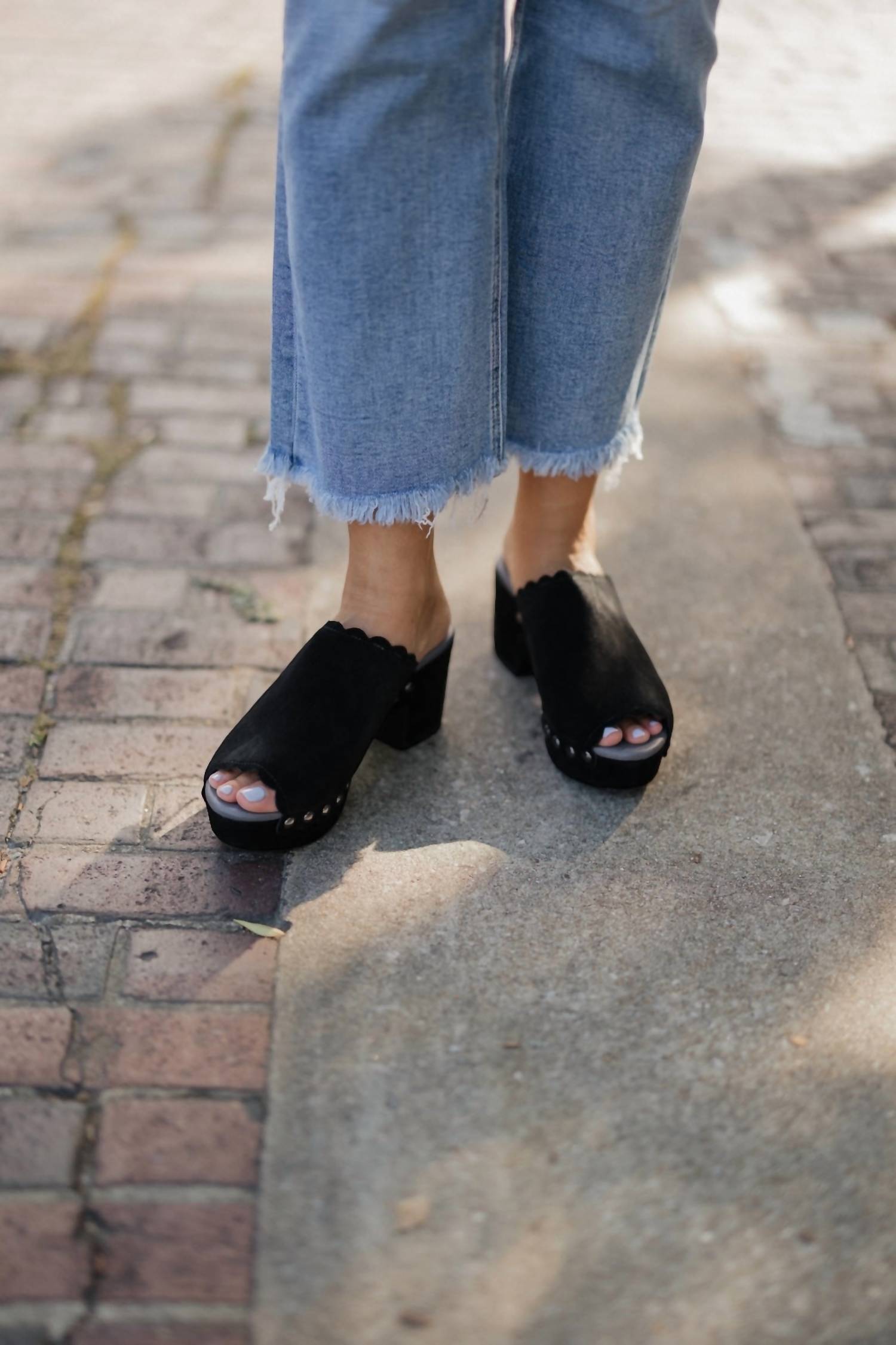 Step into elegance with the Women's Genessis Open Toe Clog by CHOCOLAT BLU, the perfect addition to your fall workwear wardrobe. Crafted with a luxurious suede upper and a comfortable leather lining, this black clog combines style with comfort. It boasts a 3" block heel and a 1 1/2" platform. Finished with a cushioned footbed and a durable rubber outsole, it's ideal for dinner parties or everyday wear.