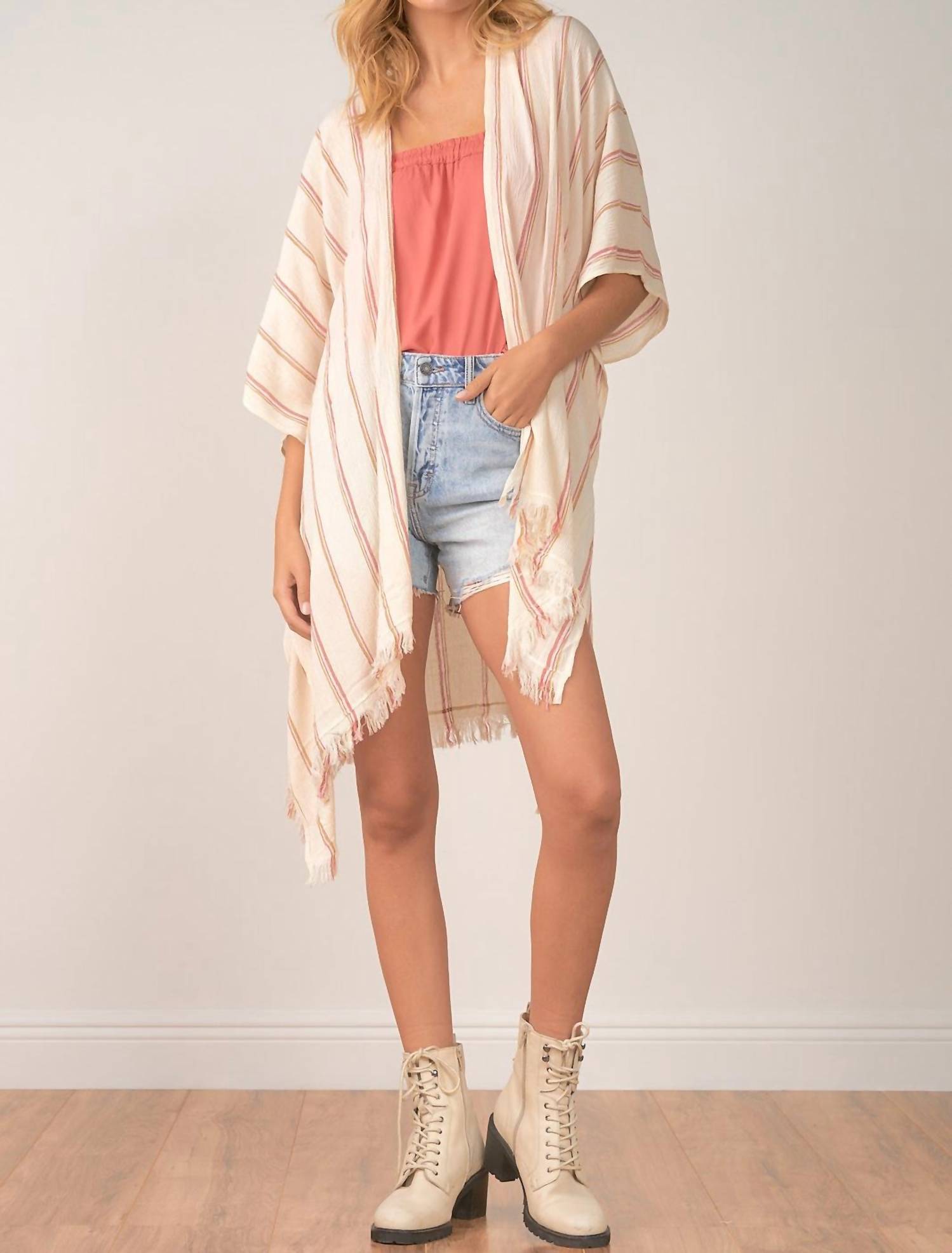 Introducing the Riley Kimono by ELAN, a must-have layer for your wardrobe in an elegant natural stripe design. This cardigan features a V-neck and three-quarter sleeves, perfect for adding a touch of Boho Chic to your fall ensembles. Ideal for travel, it effortlessly complements your favorite denim or serves as a chic swim cover-up. Care is simple with hand wash instructions, ensuring longevity and style retention.