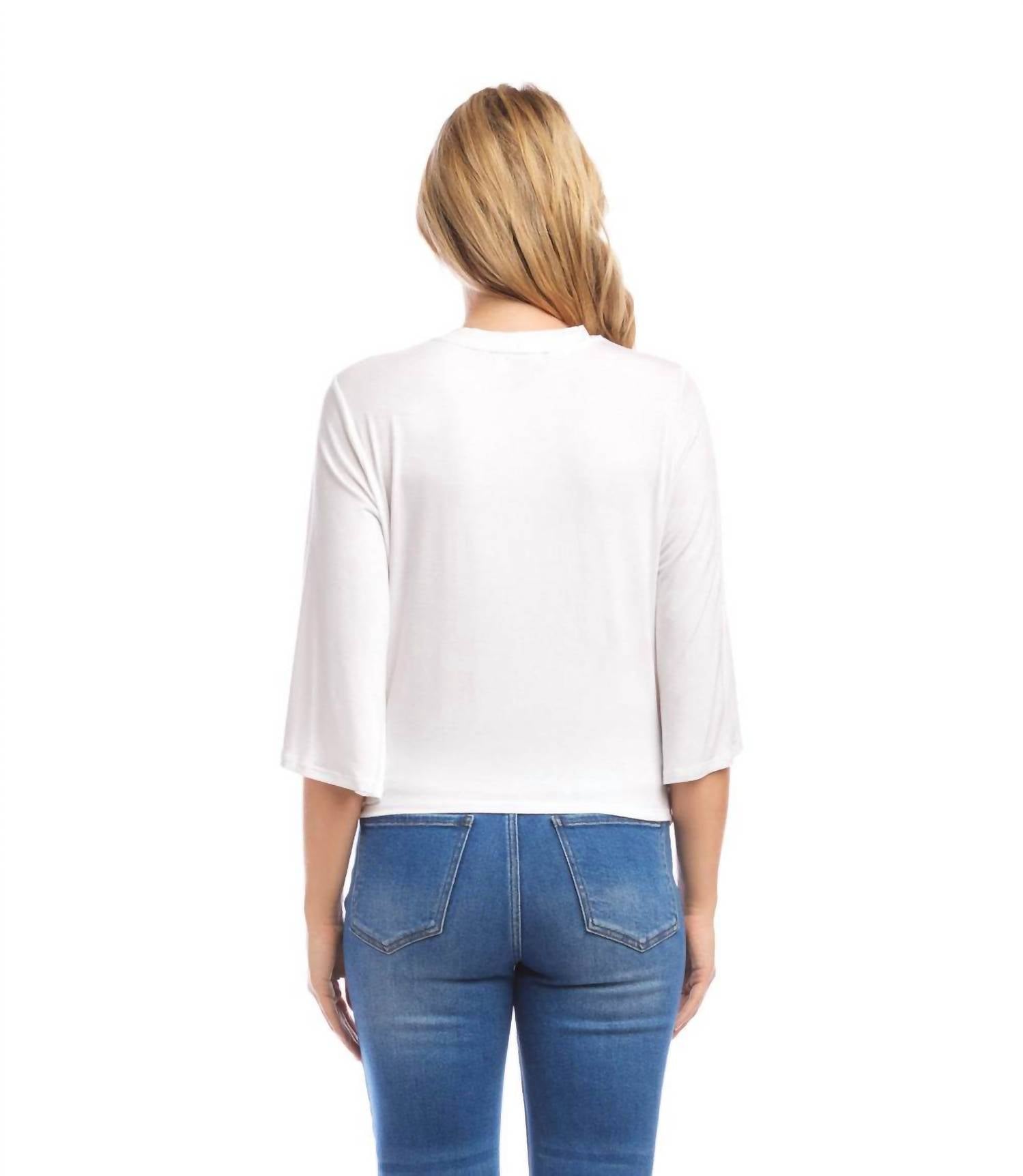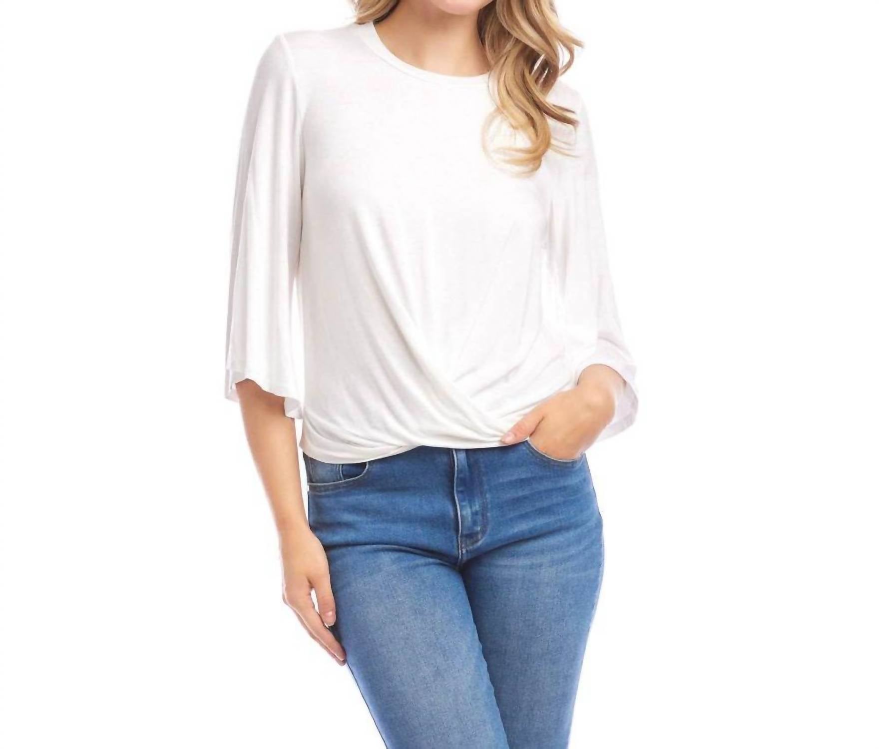 Introducing the Off White Drape Front Top by Karen Kane, a perfect blend of elegance and comfort for any occasion. This blouse features three-quarter bell sleeves and a crewneck, with a flattering twist front seam that adds a touch of sophistication. Made from 92% Rayon and 8% Spandex, this piece is designed in the USA and provides a relaxed fit with a garment length of 20 1/4 inches (size M). Care is simple with a pull-on closure; hand wash cold and lay flat to dry for lasting wear.