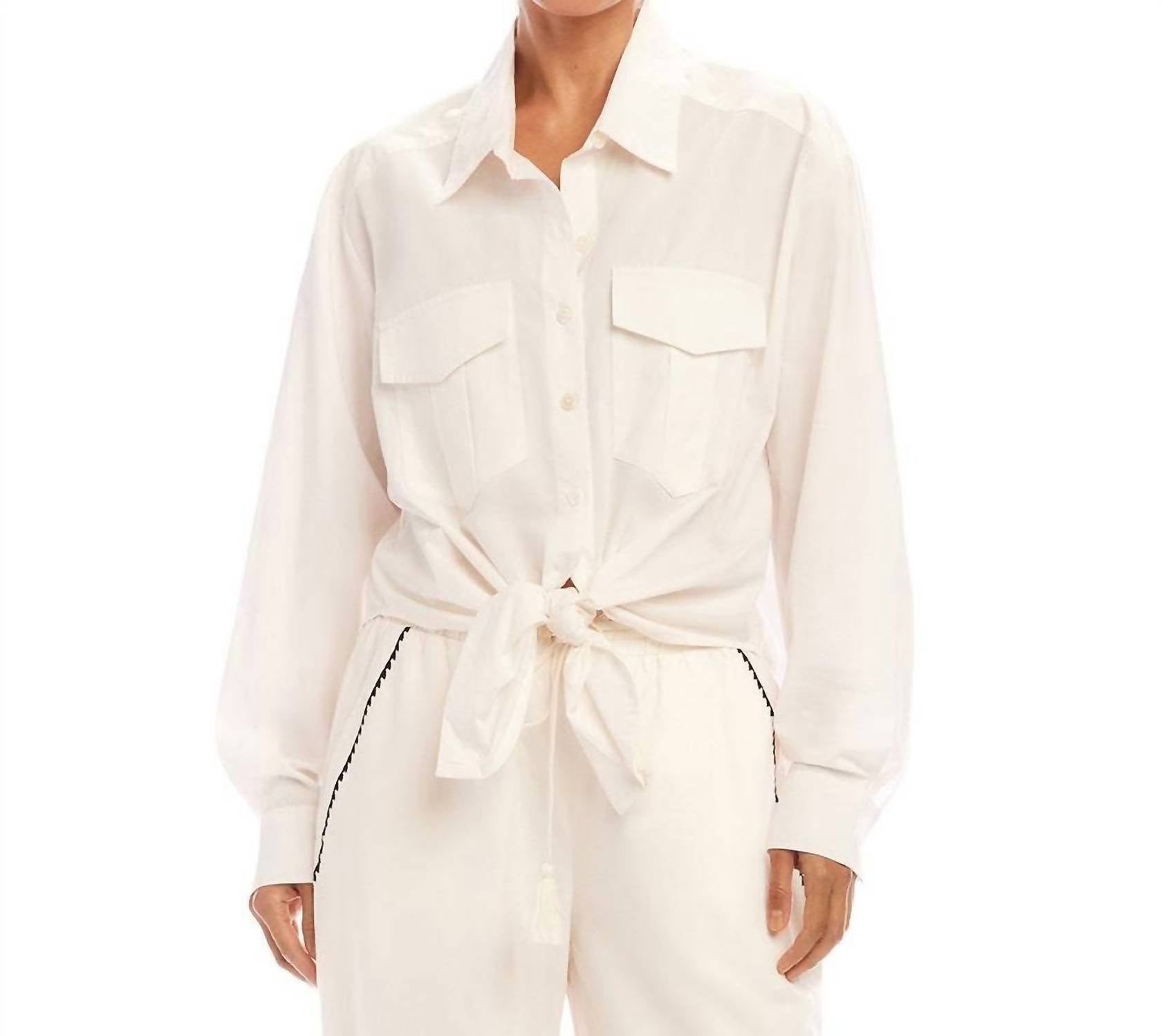 Introducing the Long Sleeve Tie-Front Top by Karen Kane, an ecru essential for every closet. The long-sleeve design offers a relaxed fit and features a tie front hem for a casually polished look. Made from 100% cotton, this imported top is equipped with practical large front flap pockets. It boasts a collared button front closure and measures 32 3/8 inches in length for a size M. Care instructions include hand wash cold and line dry or dry clean.