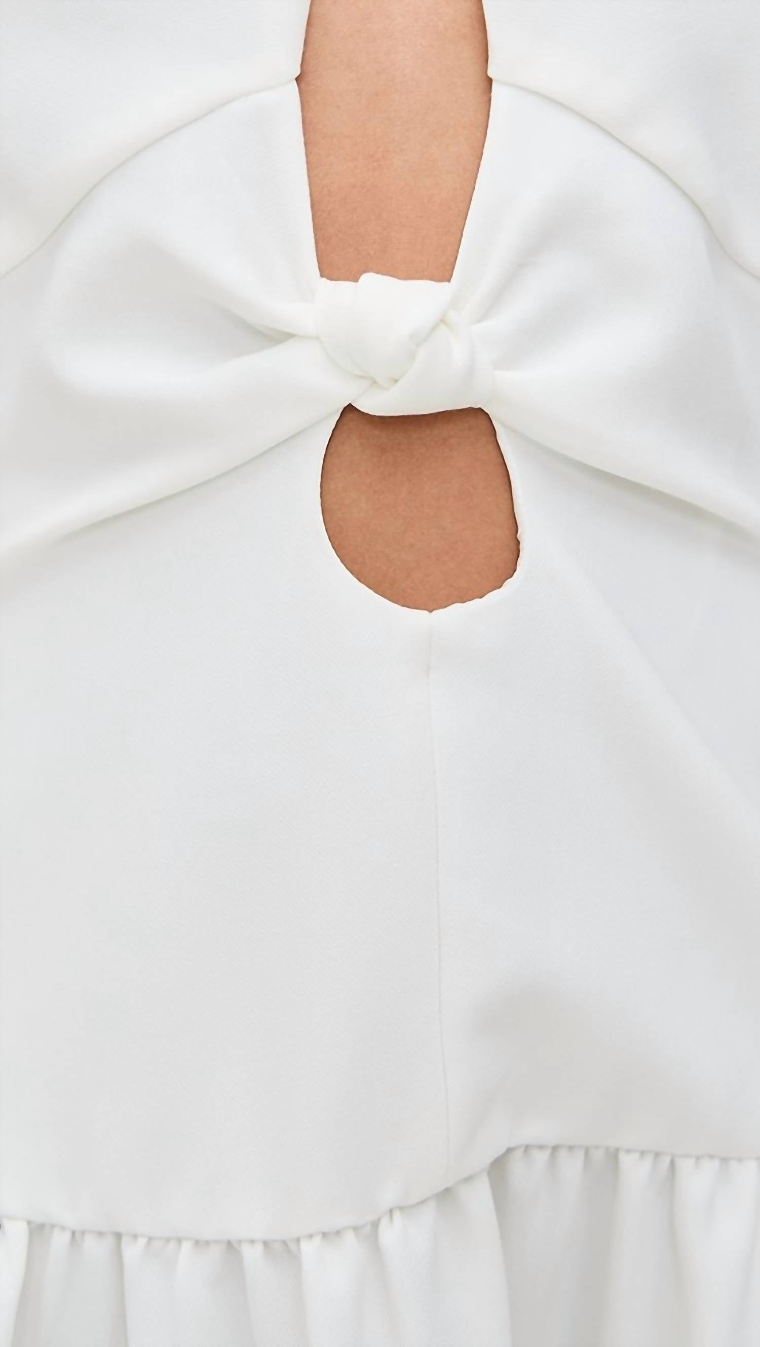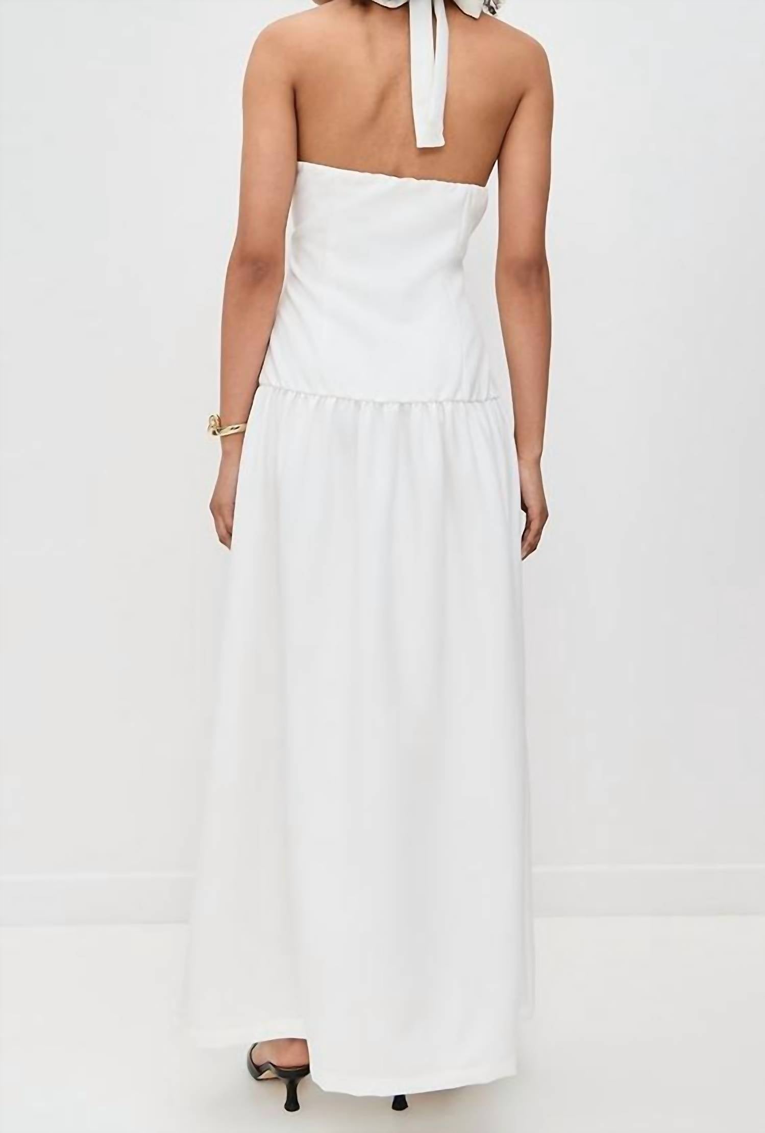 Embrace elegance with the Leona Maxi Dress by 4th & Reckless, perfect for those special moments. This sleeveless dress in off-white features a 77% Polyester, 16% Viscose, 7% Elastane composition that promises comfort and style. Designed with a flattering drop waist and A-line silhouette, it highlights a chic cut-out knot detail at the front and a sophisticated halter neckline. Originating from minimalist spring trends, it secures with a side zipper closure and is easy to care for with machine wash instructions.