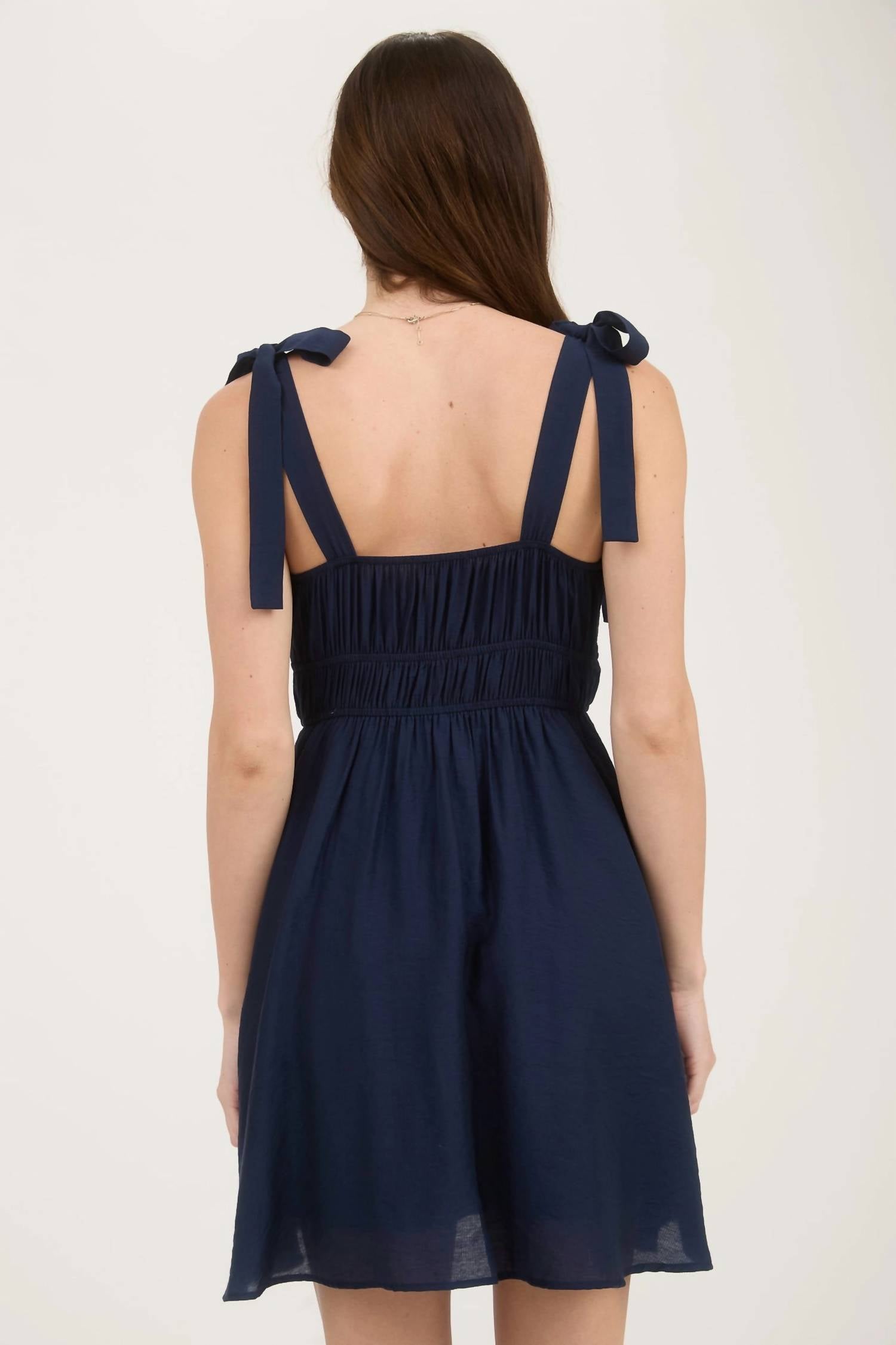 A short and breezy dress for those warmer days. Experience the effortless elegance of the Eyelet Lace Trim Mini Dress by Blu Pepper in navy blue. Designed for the minimalist trend, this sleeveless dress features a refined A-line silhouette with delicate eyelet detailing and an elegant lace trim. Made from soft rayon, it boasts adjustable tie closures and an elastic empire waist for a comfortable, flattering fit. Perfect for a vacation wardrobe, it effortlessly transitions through spring, summer, and fall with its sophisticated and versatile style.