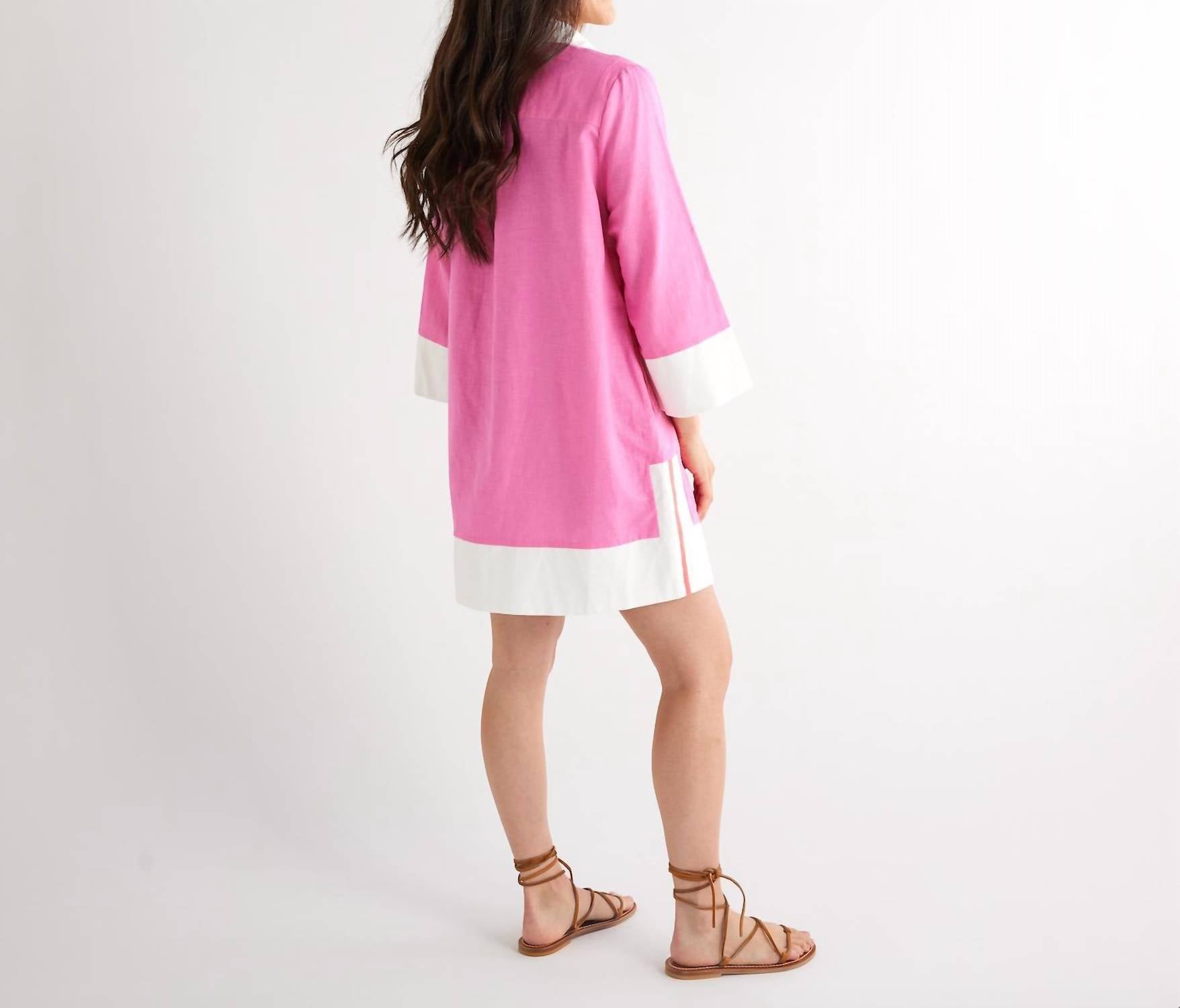 Introducing the Carrie Dress by Caryn Lawn, a chic kaftan silhouette designed for women in vibrant hot pink. This mini dress features long sleeves, no pockets, and a stylish collar neckline with a convenient button closure. Perfect for a spring dinner party or Valentine's Day celebration, it offers a solid pattern that's both trendy and vintage-inspired. Care instructions recommend hand washing to maintain its quality. Available in one size, best fitting a 4-12, with the model standing at 5'7" and typically wearing a size 2/4.