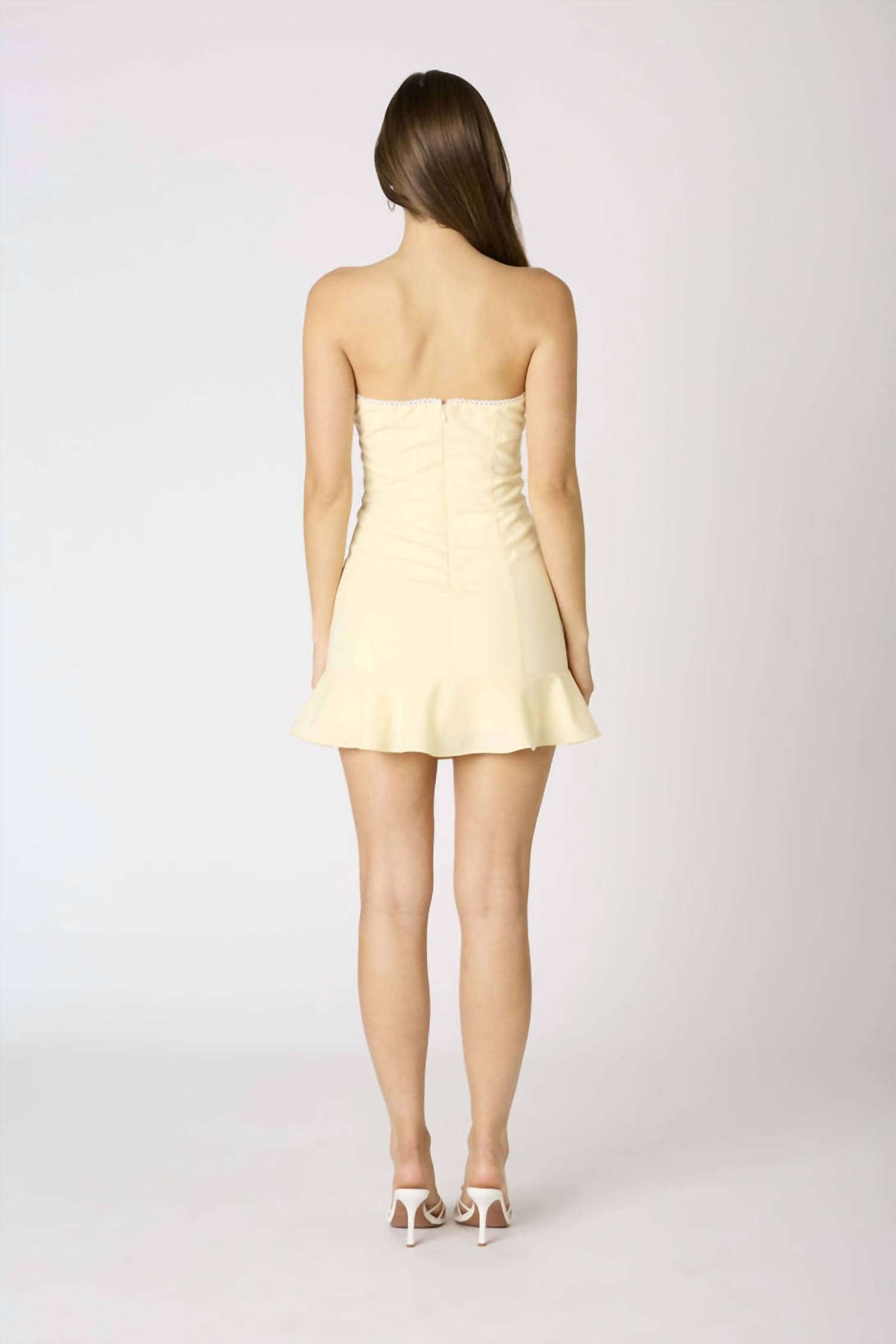 The perfect mini dress for those warmer months. Elevate your party attire with the Strapless Rosette Flirty Hem Dress by Cotton Candy, perfect for a standout look this Halloween. This mini dress in a delightful butter hue features a sheath silhouette with a sweetheart neckline, embodying the nostalgia of '90s fashion. Made with a solid pattern, it offers a sleek fit complemented by a flirty hem accentuated with rosettes. Closure is secured with a convenient zip for easy wear. Ideal for holiday parties, this strapless design promises to be a head-turner all summer long.