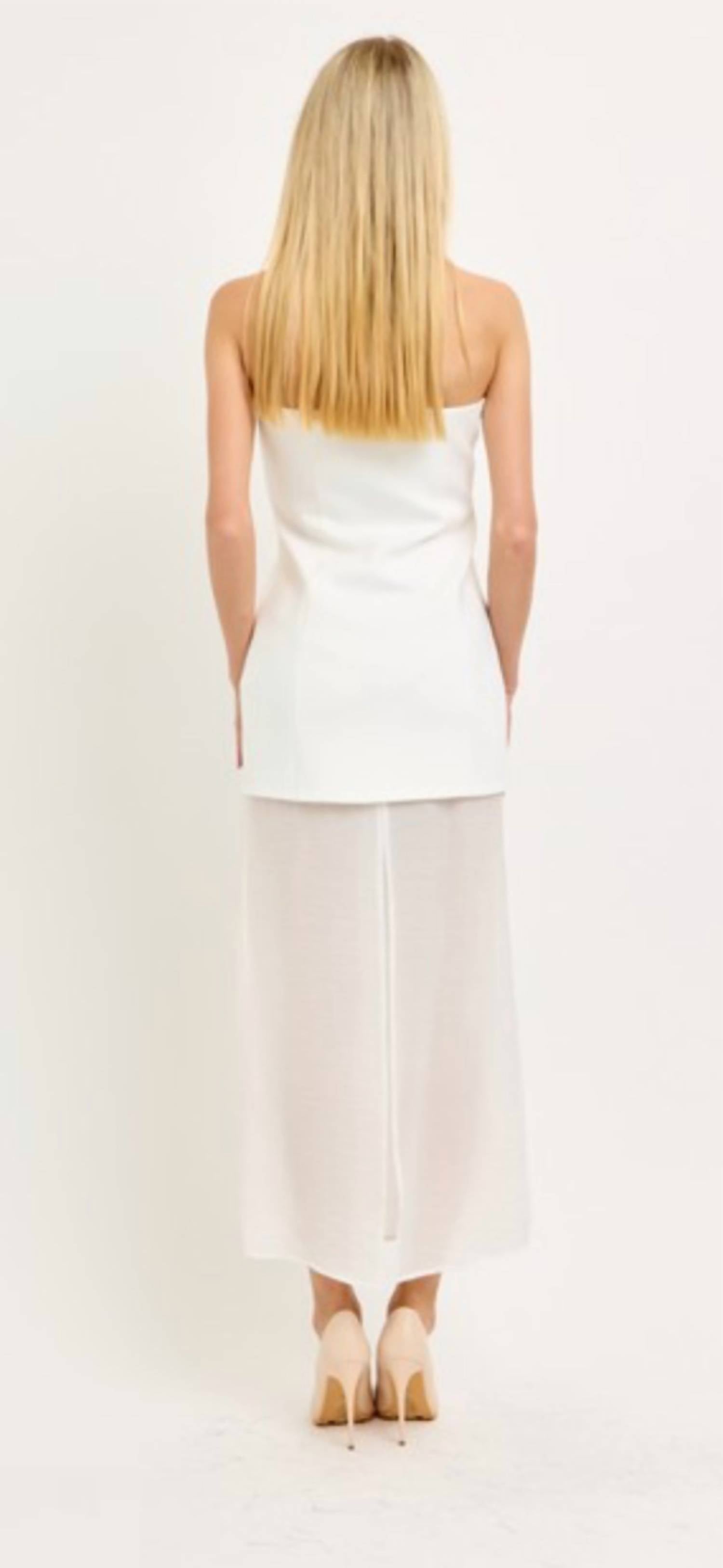 The pefect strapless dress for those warmer months. Add a cardigan for those cooler summer nights. Stunning piece in ivory designed to enhance your modern wardrobe. Strapless dress showcases a straight neck and a sheath silhouette, perfect for bridal events or graduation ceremonies. Side zipper. Dry clean only.