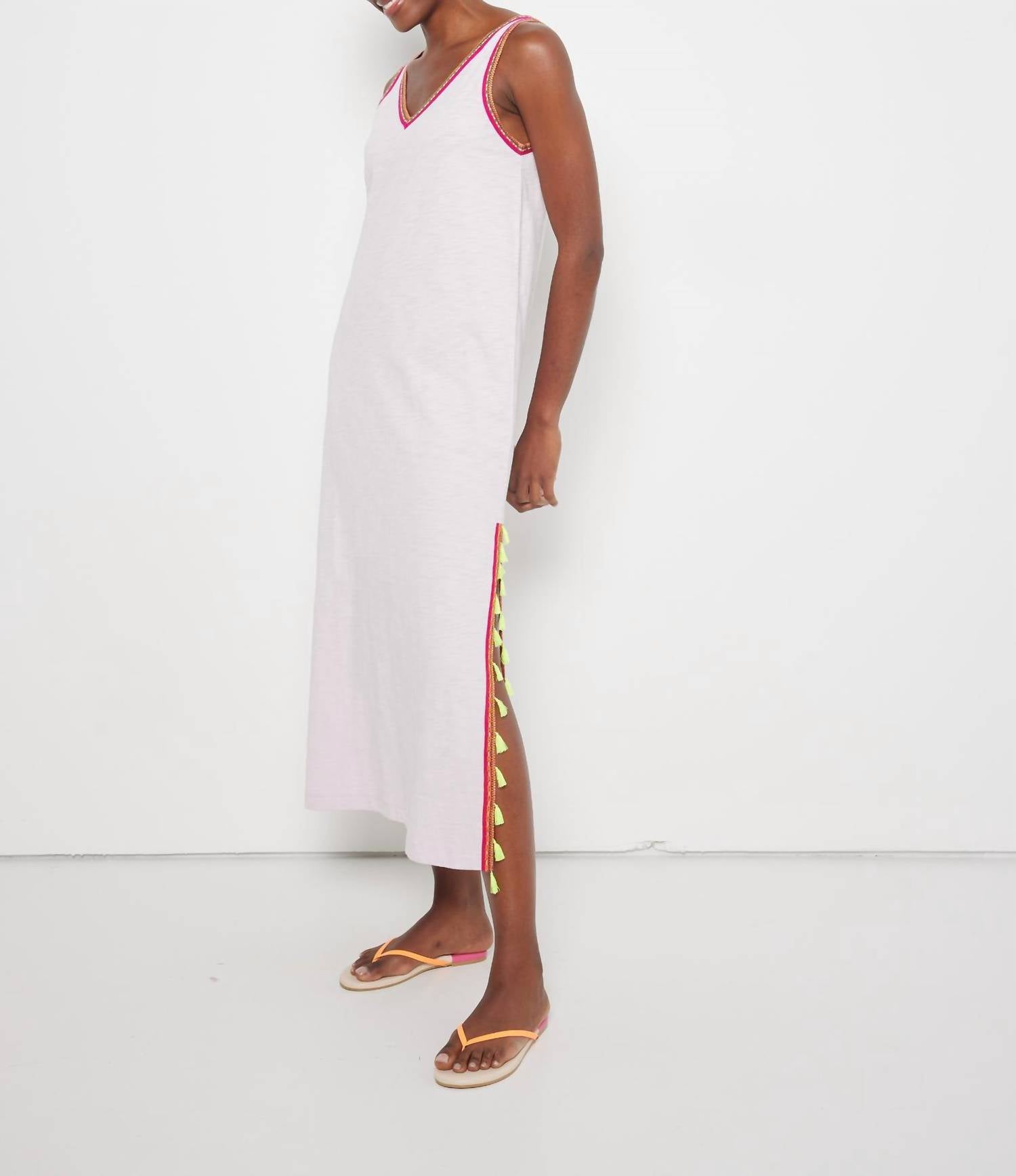 Style this maxi with your favorite statement necklace and sandals for the perfect look. Introducing the Women's Tassel Toss Dress by Lisa Todd, a boho-chic staple featuring a breezy maxi length perfect for summer vacations. Crafted from patterned cotton, this A-line dress in lilac offers a V-neckline, adding elegance to your seasonal wardrobe. While it does not feature pockets, its playful tassel details make it a standout piece for any casual outing. Care instructions include tumble drying and avoiding washing to maintain its quality.