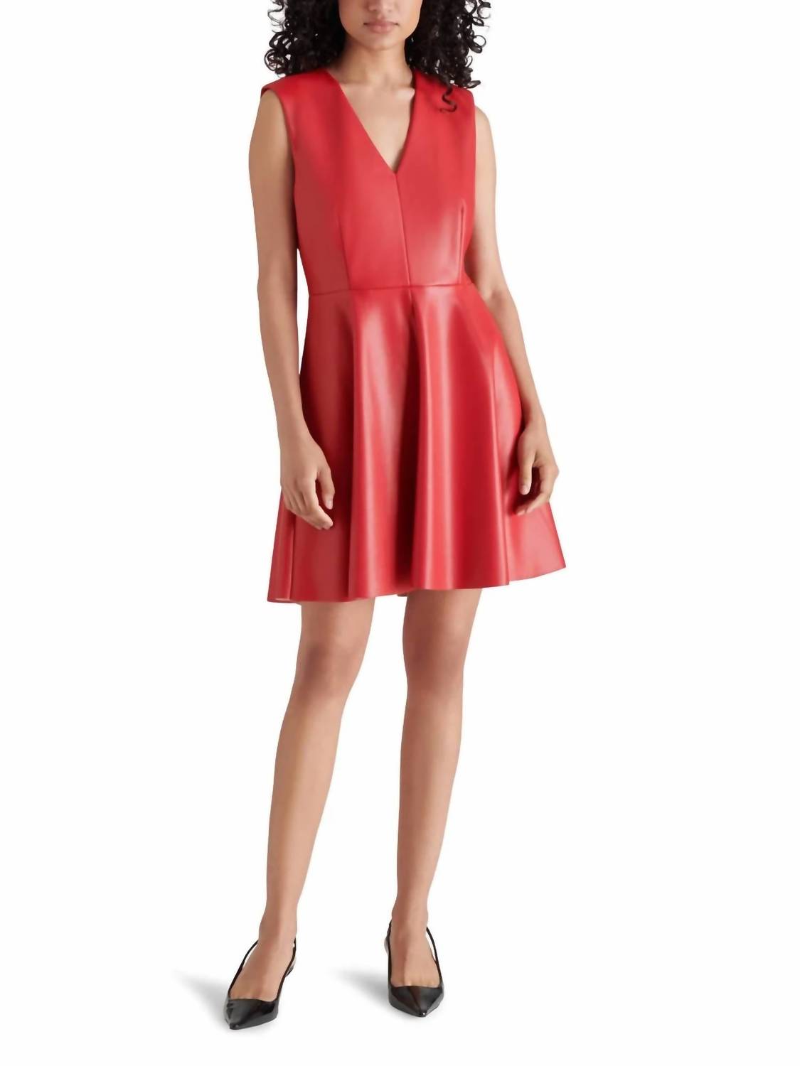 Show-stopping piece in rich dark red. Sleeveless mini dress is expertly crafted from 100% polyurethane. Offering both style and comfort with its buttery soft faux leather. Designed with a flattering A-line silhouette. Features a chic V-neckline and convenient zip closure at the back. Garment length: 35". Spot clean.