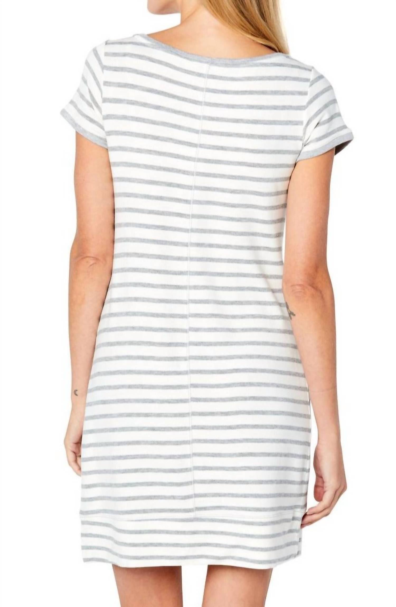 Experience comfort and style with the Malibu Short Sleeve Lounge Dress by Twelve Eighty Eight. Crafted from super soft viscose fabric, this mini dress features a relaxed scoop neck and practical side pockets, offering the perfect blend of luxury and everyday wear. It sports a chic A-line silhouette in a gray striped pattern, ideal for lounging at home or casual outings. Designed for women with a pull-on closure, it’s easy to care for with machine wash instructions.
