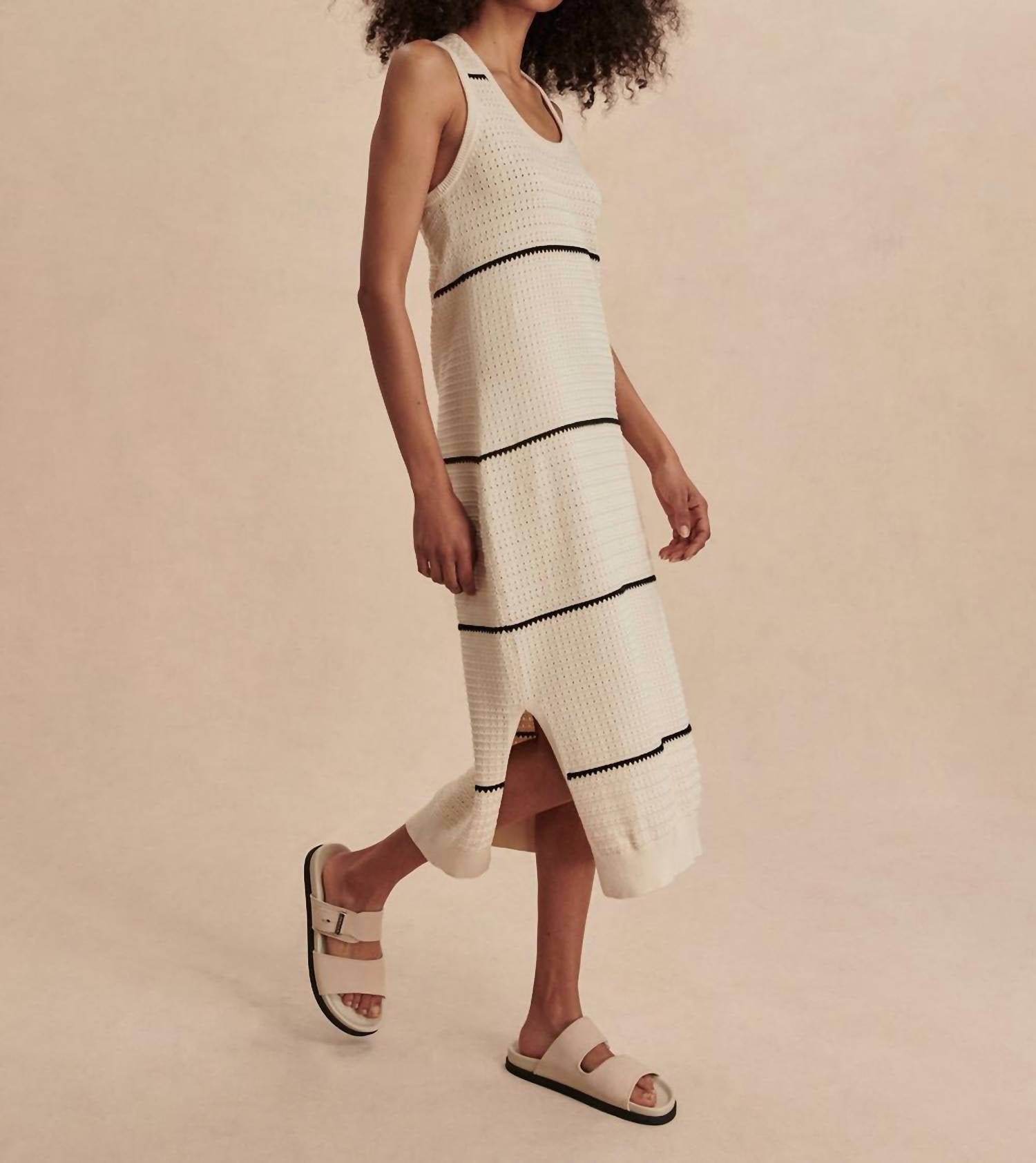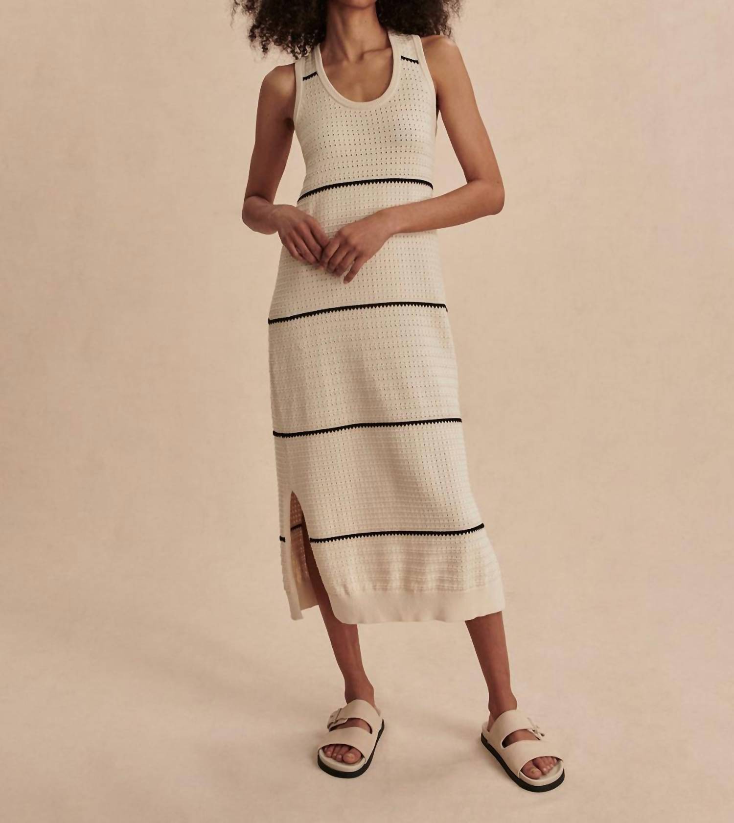 A midi dress so versatile, your options for wearing it are endless. Discover the Scott Scoop Neck Midi Dress by VARLEY, a sophisticated choice for summer gatherings. This sleeveless, striped midi dress is crafted from 100% cotton, offering breathable comfort and stylish minimalism. The dress features a scoop neckline with subtle contrast stitching and side slits that add a contemporary edge. Designed without pockets, it has a shift silhouette and a pull-on closure for effortless wear. Care instructions: Machine wash and line dry.