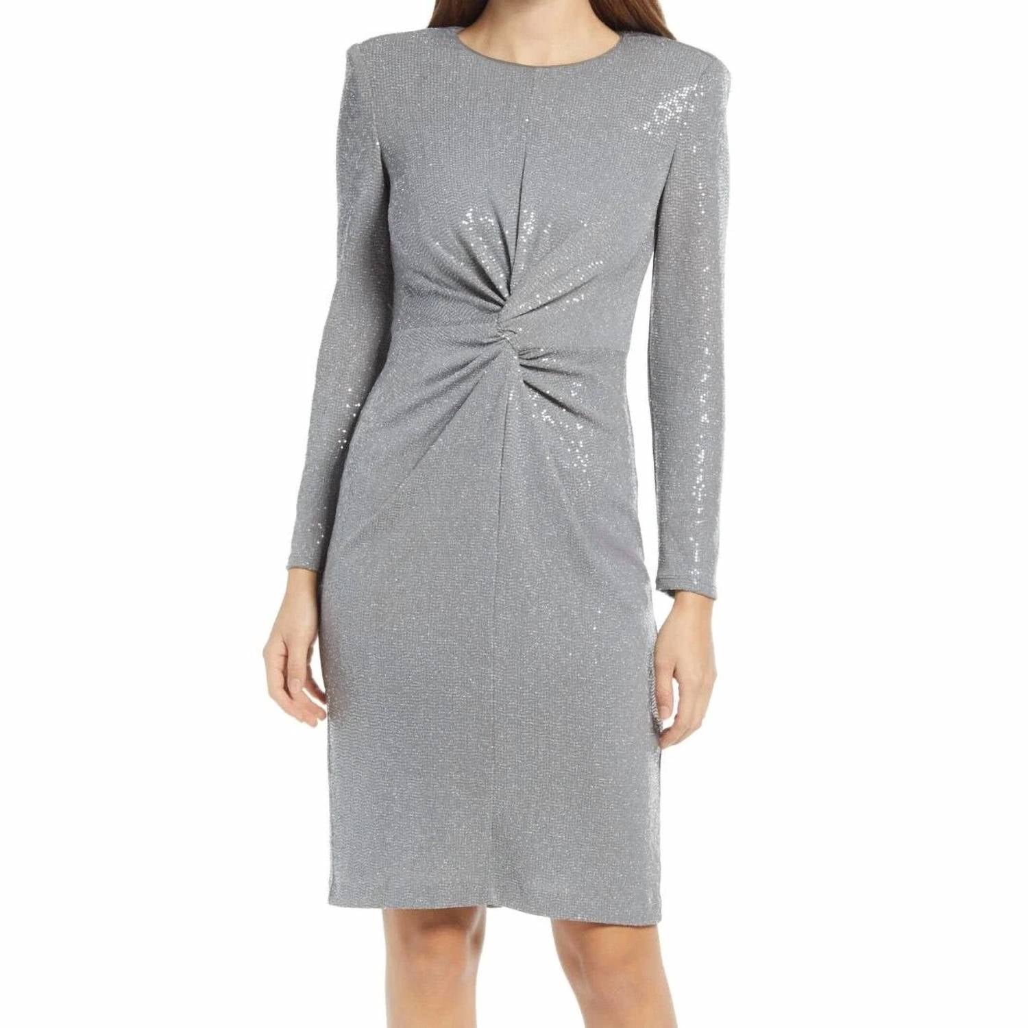 Cute and comfortable, this long sleeve dress has it all. Dazzle in the VINCE CAMUTO Sequin Long Sleeve Sheath Dress, perfect for New Year's Eve celebrations. Crafted from 95% polyester and 5% spandex, this textured silver dress offers a sleek, body-conscious fit complete with a crewneck and long sleeves for chic appeal. It's thoughtfully lined for comfortable wear, ensuring you can shine all night long. Hand wash as needed to maintain its stunning appearance.
