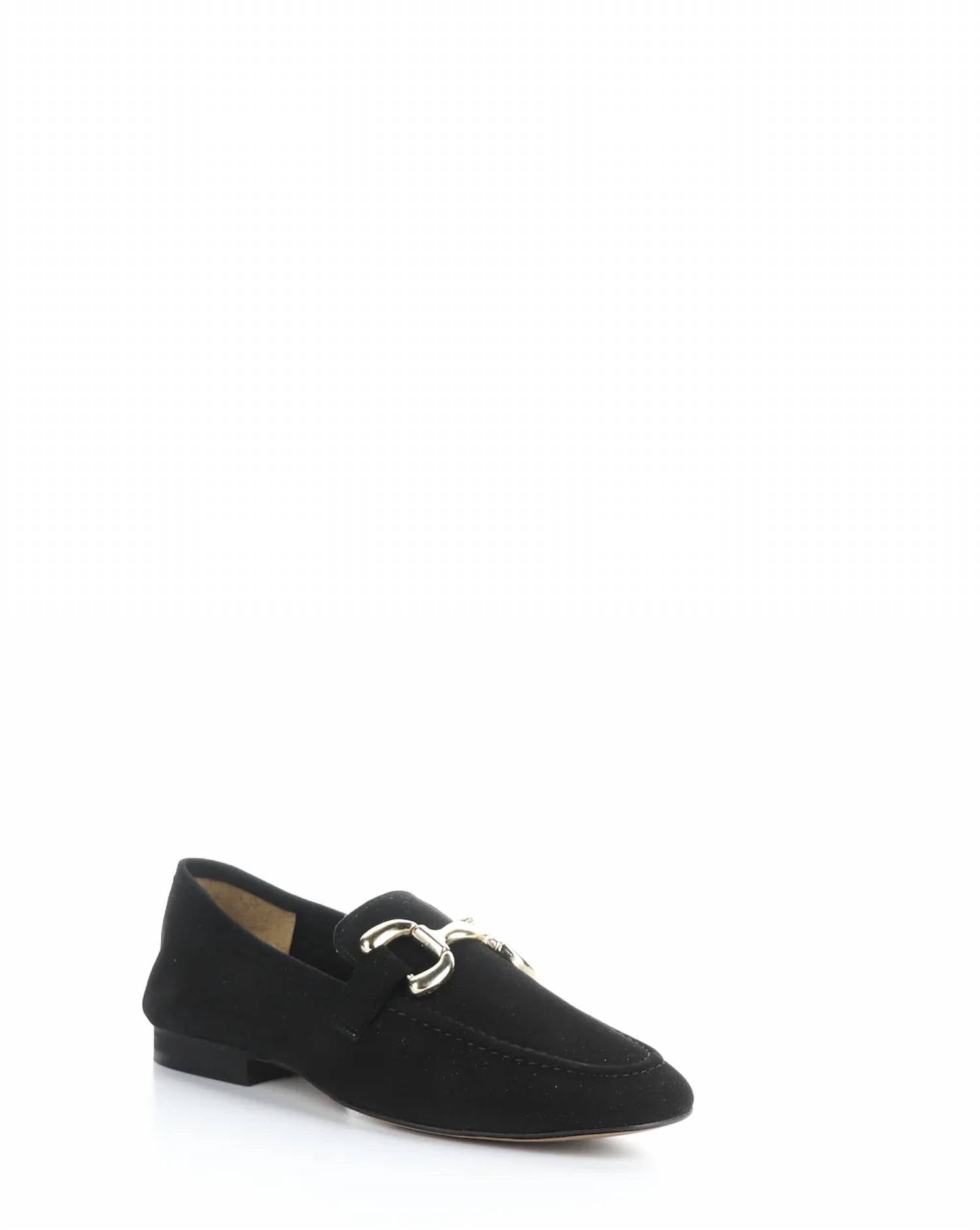 Loafers so versatile you can wear them with just about anything. Step up your style with the Women's Macie Suede Slip-on Shoes by Bos. & Co., a vintage-inspired loafer perfect for any wardrobe. Crafted from kid suede, this black flat features a sleek squared toe and a decorative metallic bit. Made in Portugal, it includes a cushioned insole and flexible sole, ensuring all-day comfort with a subtle 0.4" flat heel. Embrace the workwear trend with a loafer that pairs functionality with an elegant touch.