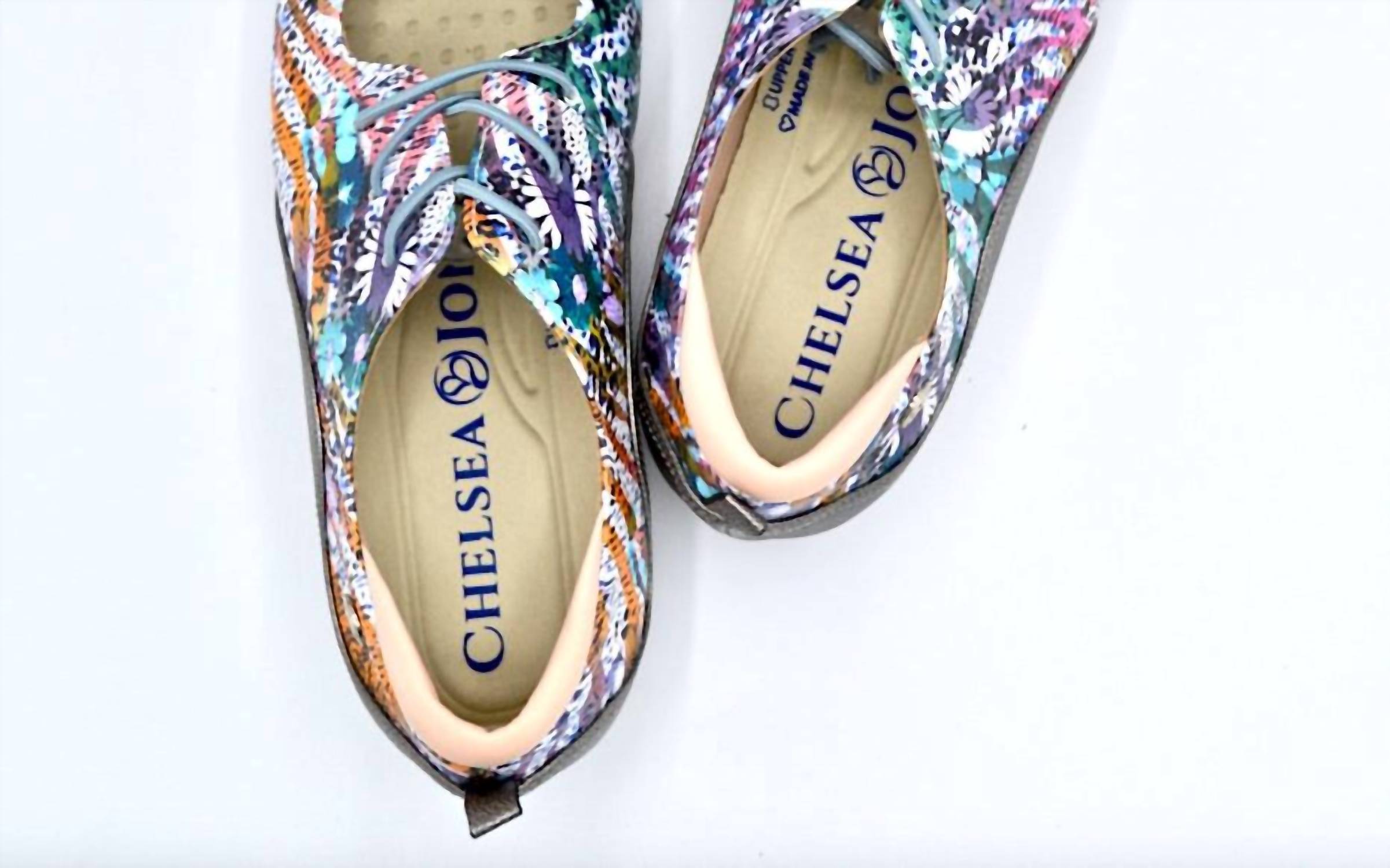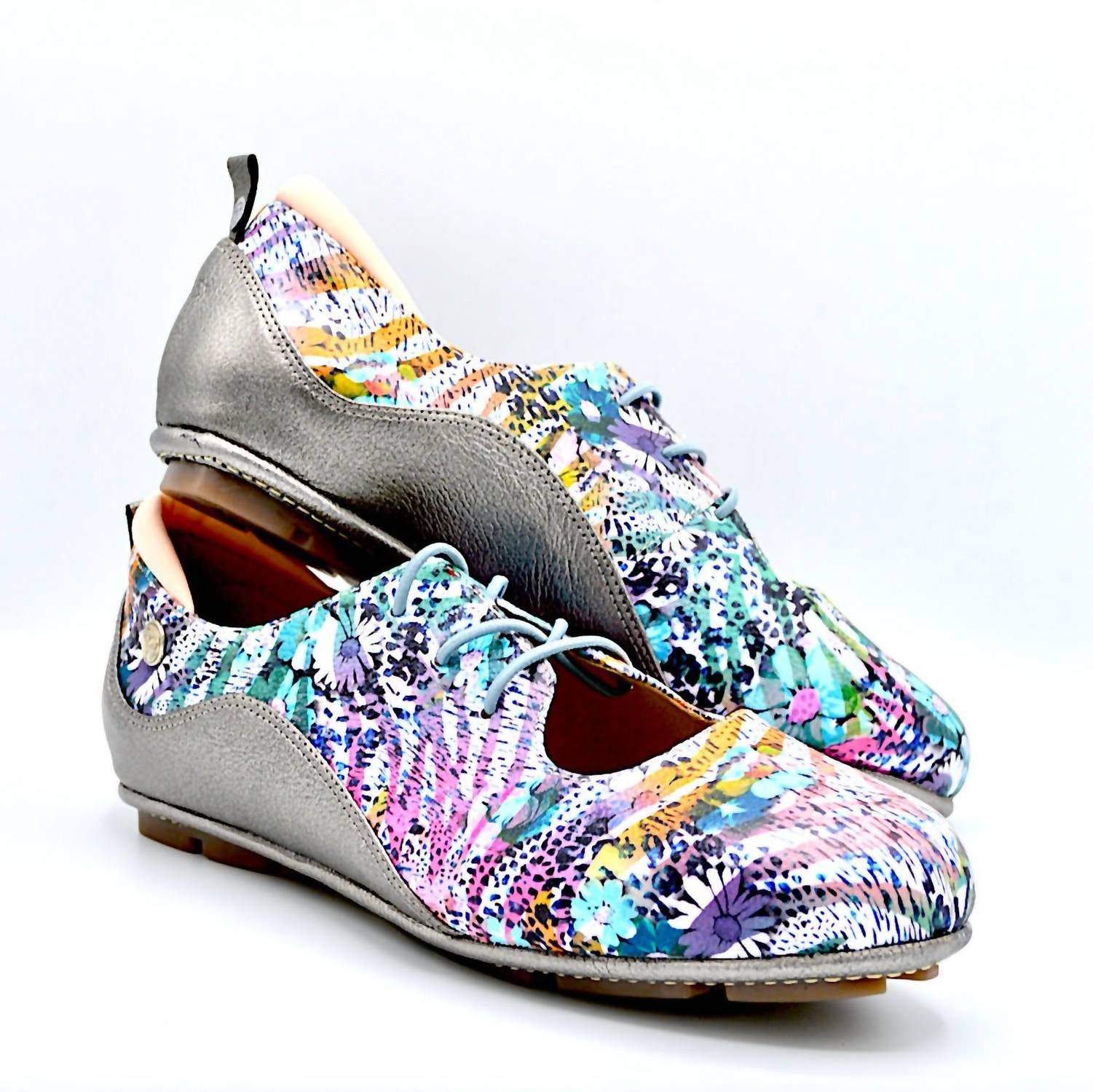 Loafers so versatile you can wear them with just about anything. Discover the Women's Vibe Slip-on Flat Shoes by Chelsea Jones, an elegant choice for every day with an abstract print and silver leather. Designed with a 10mm rubber driver-style sole, they boast a leather upper and liner for a luxurious feel. Enjoy the comfort of a fabric-lined cushioned insole with arch support and unique stretch elastic laces for a personalized fit. Made in Colombia, these flats feature Lycra padding around the Achilles for added comfort, perfectly aligning with the maximalist trend for summer engagement occasions.