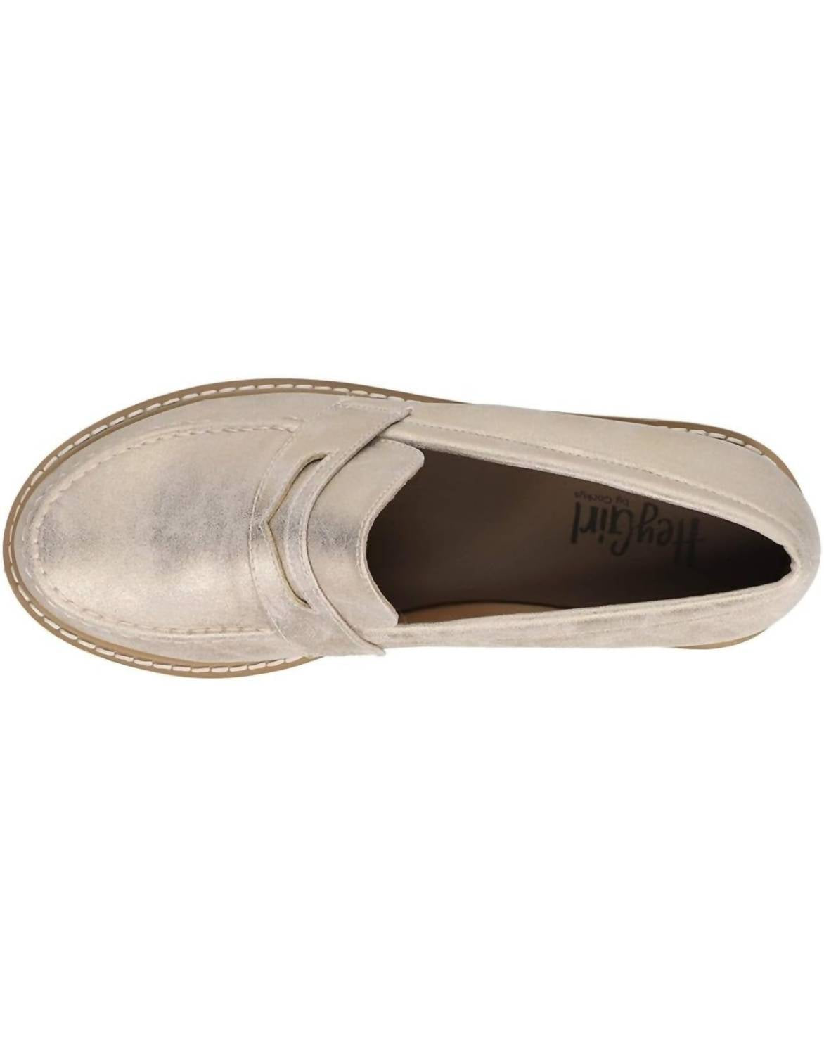 A preppy yet feminine take on the classic loafer. Slip into elegance with the Women's Boost Gold Metallic Loafers by Corkys Footwear, crafted from luxurious faux suede. These chic loafers boast a sophisticated round-toe design, set on a low, chunky 1.5" heel, perfect for a stylish and comfortable stride. Ideal for summer occasions, including anniversaries and Christmas celebrations, they embody the quiet luxury trend. Enjoy effortless style with these versatile loafers that seamlessly complement any wardrobe.