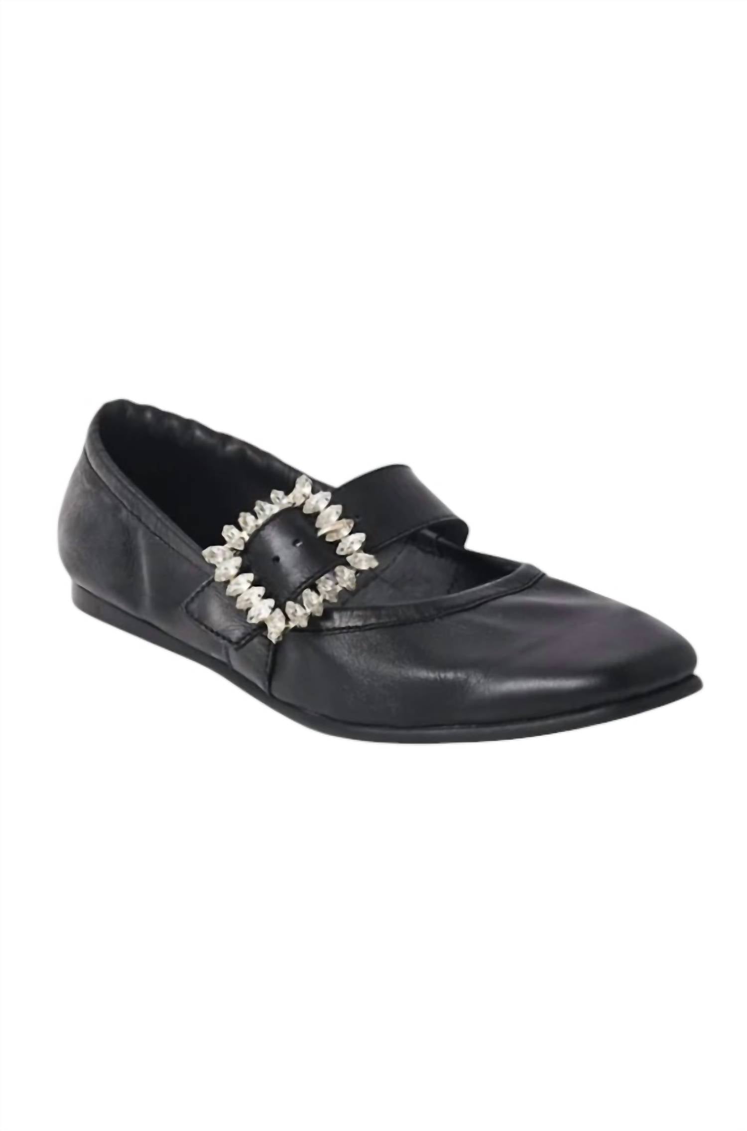The ballet flats feature a thicker vamp strap with a bejeweled rhinestone buckle for added sparkle. They have leather uppers, a square toe, an adjustable vamp strap, and a flat sole. Slip-on style. Imported.