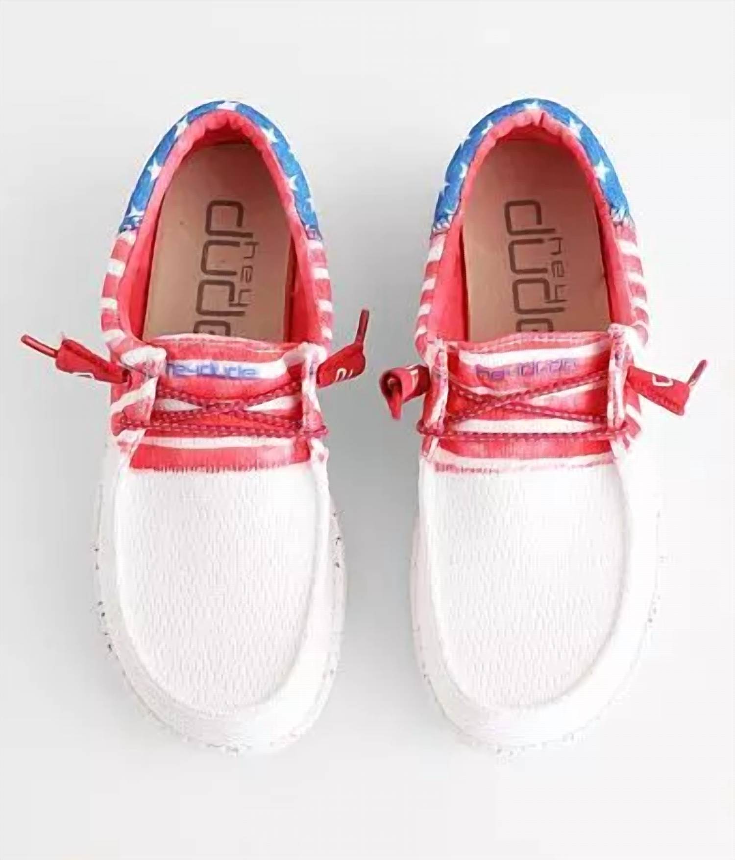A preppy yet feminine take on the classic loafer. Step into patriotic style perfect for showcasing your Americana pride. Feature a lightweight stars and stripes print with stretch drawcord laces for an easy fit. Designed with a cushioned leather insole and a platform heel, offering both comfort and style with flex & fold technology. Outer and lining 100% polyester, insole leather, outsole 100% textile. Machine wash cold and wash insoles separately with mild soap, avoiding direct heat or sunlight for drying.