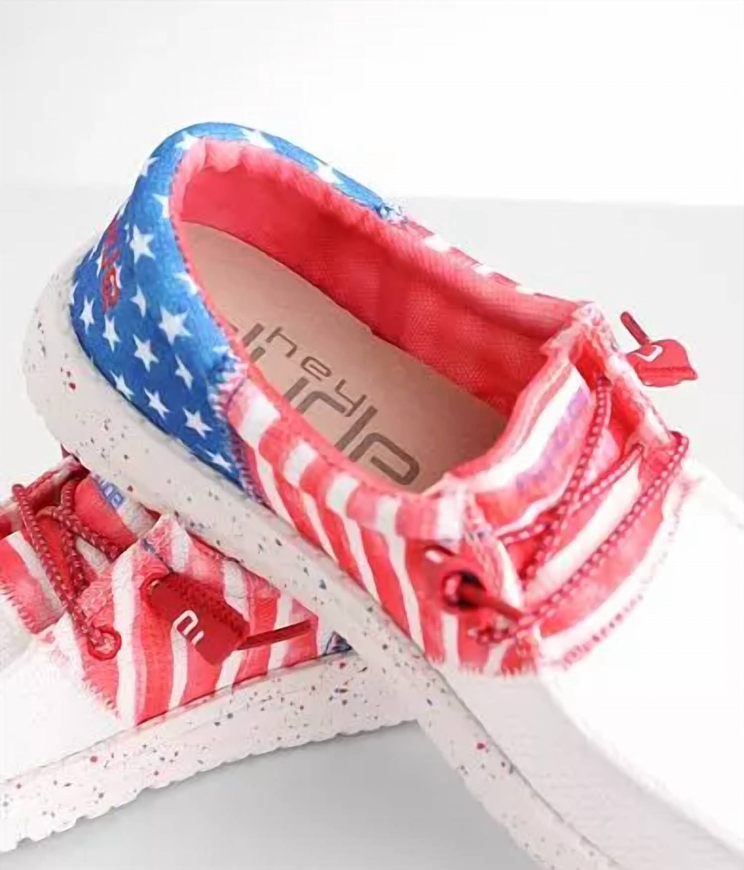 Step into patriotic style perfect for showcasing your Americana pride. Feature a lightweight stars and stripes print with stretch drawcord laces for an easy fit. Designed with a cushioned leather insole and a platform heel, offering both comfort and style with flex & fold technology. Outer and lining 100% polyester, insole leather, outsole 100% textile. Machine wash cold and wash insoles separately with mild soap, avoiding direct heat or sunlight for drying.