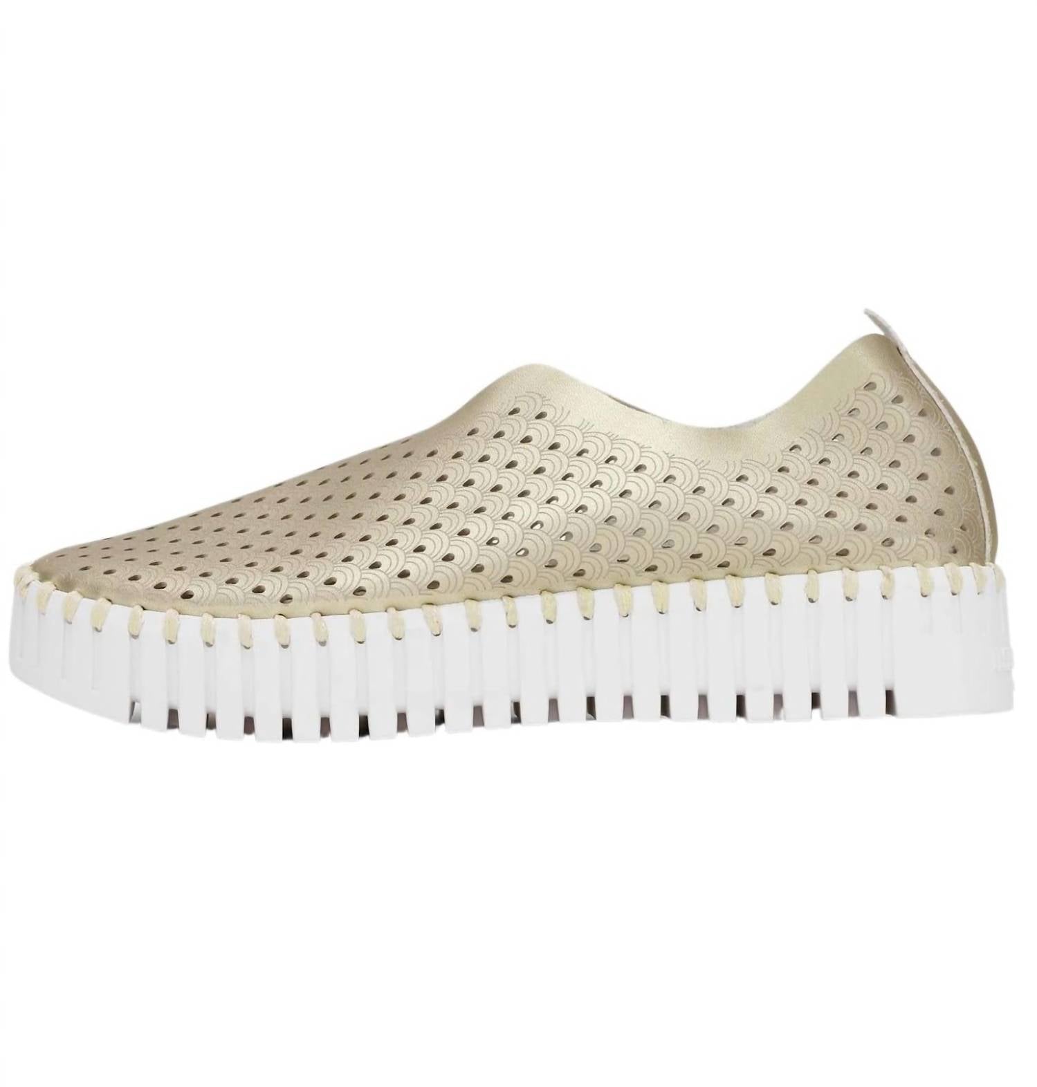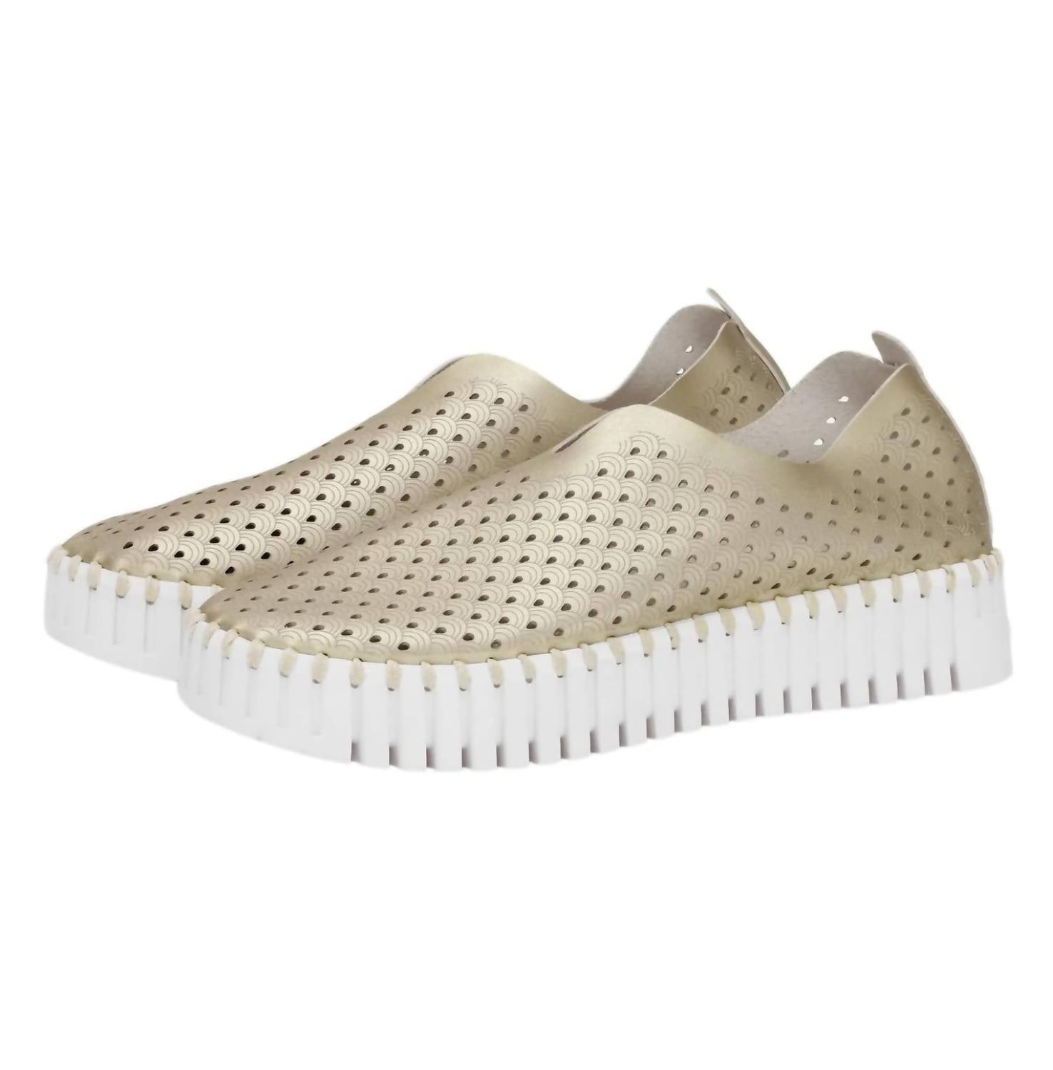 A preppy yet feminine take on the classic loafer. Meet the Women's Tulip U0010 Shoes by Ilse Jacobsen, a sustainable and stylish addition to your footwear collection. Crafted from recycled microfiber with a decorative laser cut pattern in an elegant platinum hue, these shoes are both eco-friendly and chic. The flexible platform sole consists of 75% natural rubber and 25% recycled rubber, providing comfort and durability with a flat heel and round toe design. Inside, enjoy the luxury of a pigskin-lined insole made from 60% EVA and 40% pigskin, perfect for all-day wear.