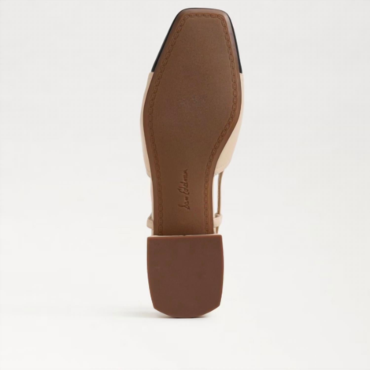 Sam Edelman's Women's Kara Slingback Flats in sand and black offer a chic yet casual look perfect for any occasion. The flats feature a distinctive square toe and a classic slingback silhouette enhanced by a convenient buckle closure. Crafted from a blend of leather, synthetic, and fabric materials, these flats have a comfortable synthetic insole and a stylish 1-inch flat heel. Ideal for springtime or a music festival, they bring a 90s fashion vibe with a versatile touch.