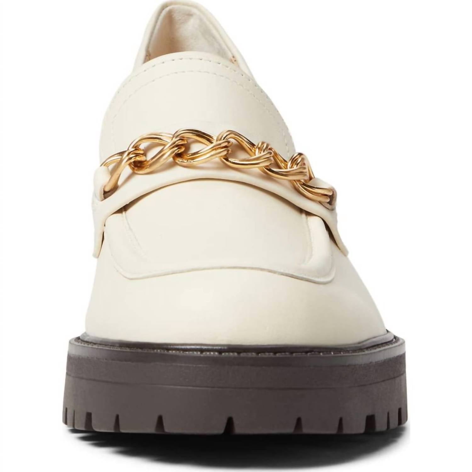A preppy yet feminine take on the classic loafer.Slip-on heeled loafer with round toe and front metal chain accent. Manmade upper, lining, and insole. Durable, lugged, manmade outsole. Measurements: Heel Height: 1 3⁄4 in - Weight: 1 lb 1 oz