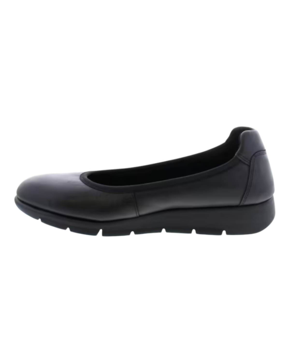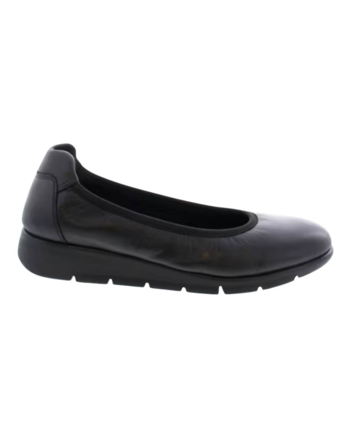 These sleek black leather ballet flats, handcrafted in Portugal, offer exceptional comfort with a snug elastic topline and flexible rubber sole. Featuring a chic 1" heel and classic round toe, they’re ideal for all-day wear with a leather upper and textile lining.
