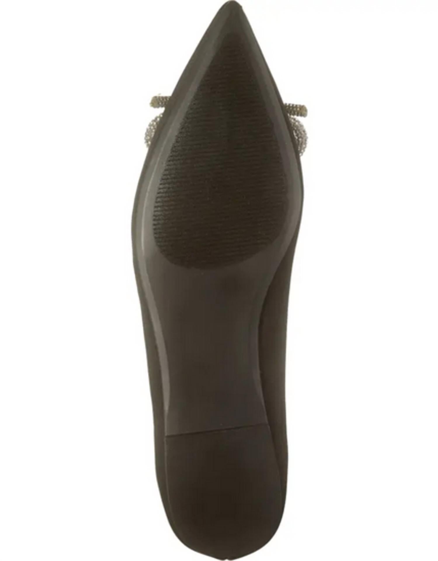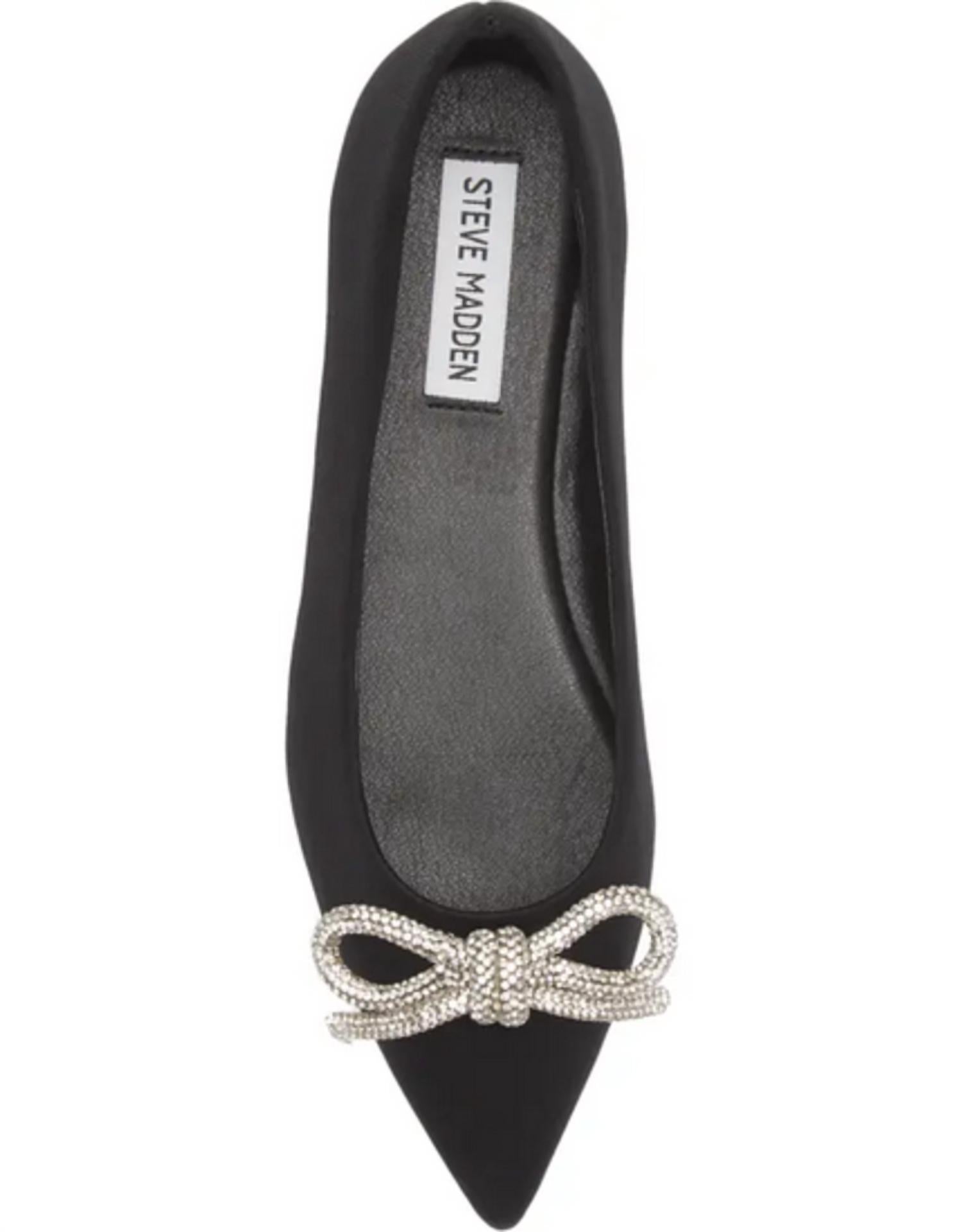 A preppy yet feminine take on the classic loafer. The Women's Elina Satin Ballet Flats by Steve Madden offer a whimsical touch with a crystal-studded bow shimmering on the vamp. Designed with a pointed toe for a sleek silhouette, these flats are perfect for adding elegance to your ensemble. Available in a classic black color, these shoes effortlessly combine style and comfort. Ideal for adult women, they cater to those seeking a sophisticated yet playful addition to their footwear collection.