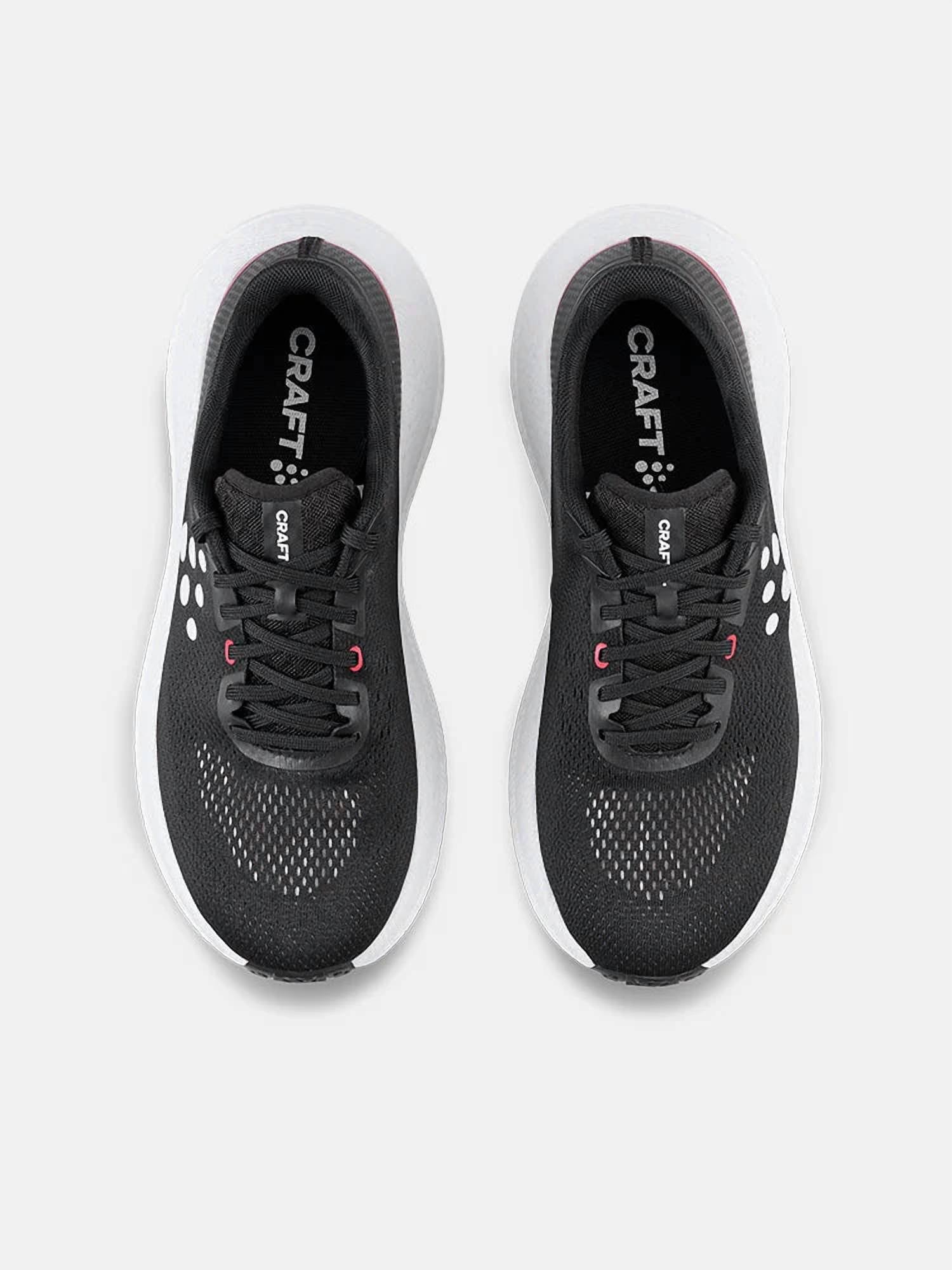 Introducing the Women's Xplor Shoes by Craft Sportswear, where superior design meets advanced performance. With a breathable one-piece engineered mesh upper composed of 50% recycled polyester, these shoes offer unmatched comfort on varied terrains. The innovative Vittoria™ outsole provides exceptional traction, while the Px Foam™ midsole ensures superior energy return and shock resistance. Ideal for fitness enthusiasts, these athletic shoes in Black weigh 240 grams in UK size 6 and boast a heel height of 38.5mm and a forefoot height of 32.5mm, offering a 6mm drop. Material composition: 100% Polyester-Recycled, 100% ETPU Foam midsole, and 100% Rubber outsole.