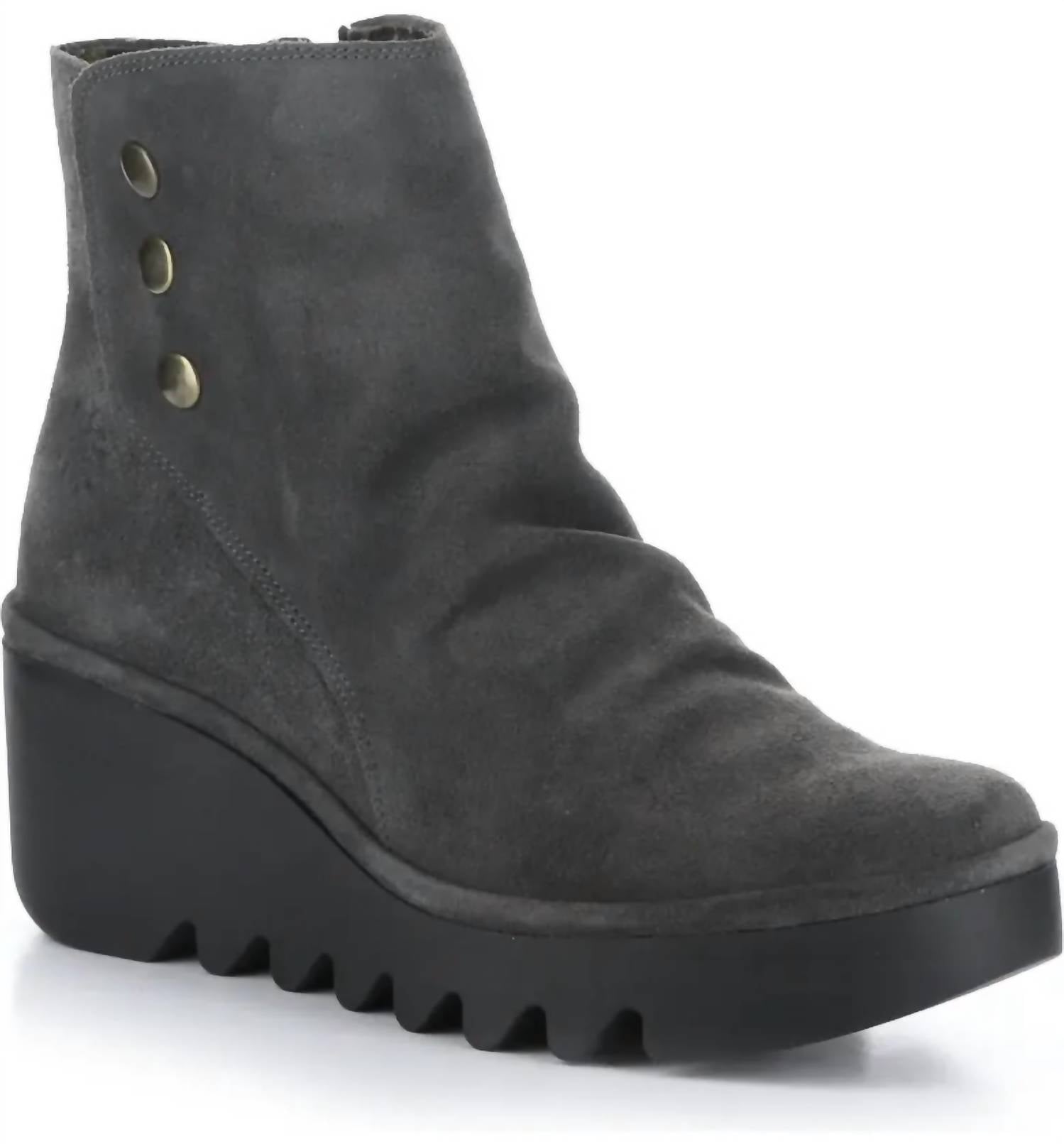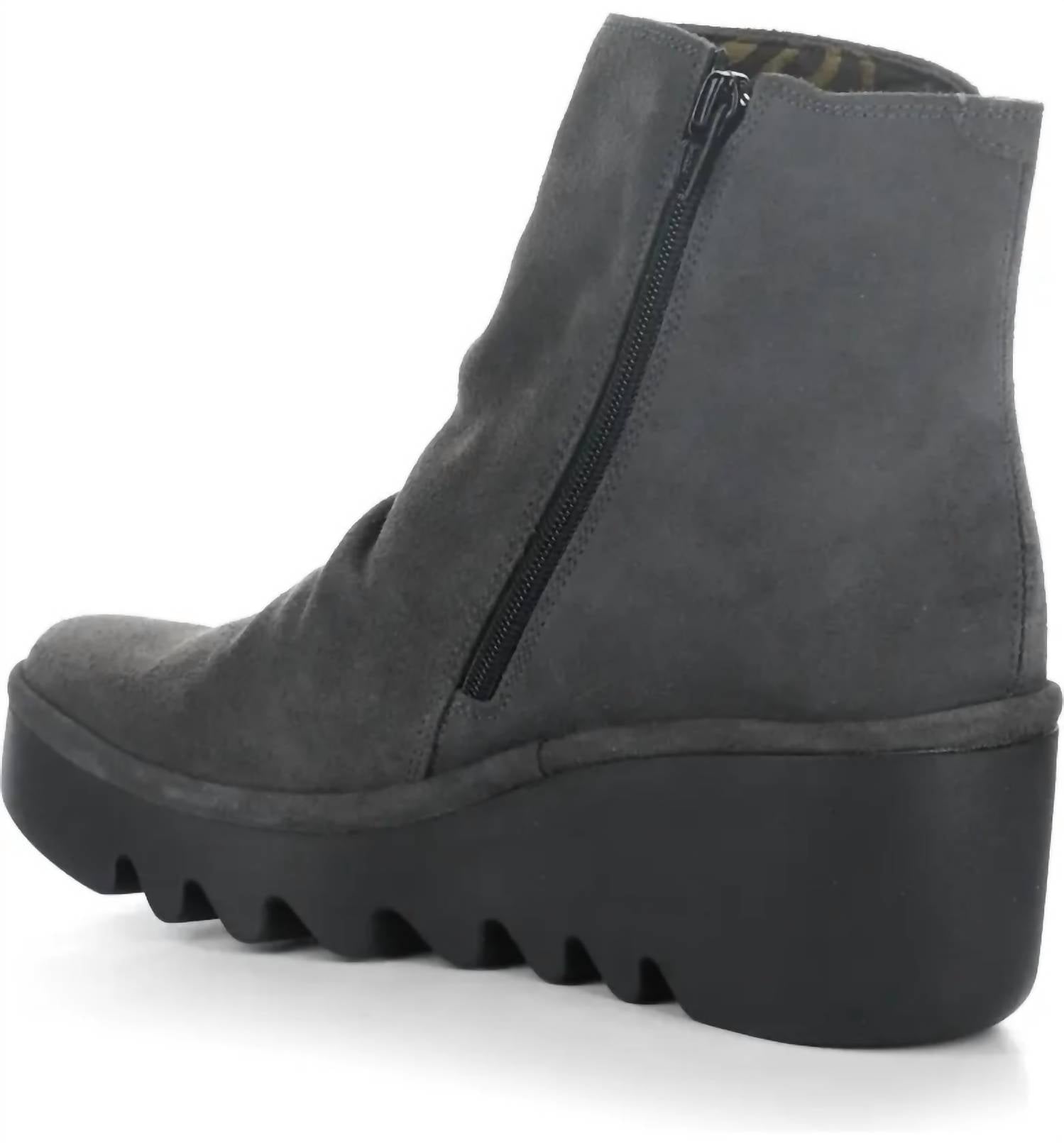 Experience the stylish comfort of the Brom Zip Up Ankle Boots by FLY LONDON, crafted from Oil Suede Diesel for a unique look. These women's boots feature a round toe and a lightweight wedge heel with a height of 3 inches, offering a perfect blend of height and support. The mid heel height of 2 1/4"-3" ensures comfortable wear from day to night. Designed with a shoe width of medium, these boots are an essential addition to any wardrobe.