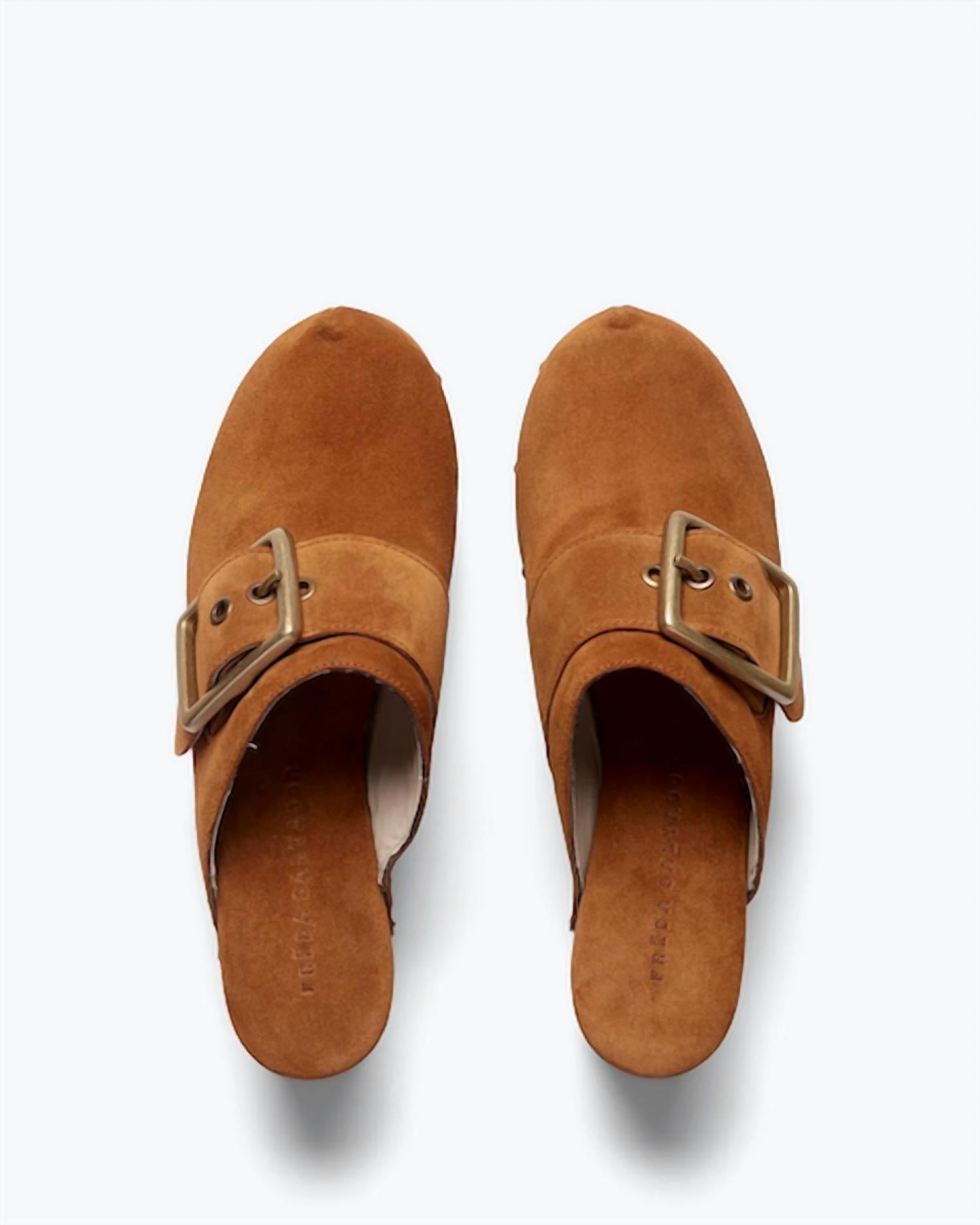 Step into sophistication with the Women's Jazz Clog by FREDA SALVADOR, a chic mule crafted with bronze suede leather. 100% Spanish Leather. Featuring a round toe and a classic wooden platform sole, these clogs boast a 2.25-inch mid-height heel, perfect for a stylish yet comfortable lift. The slip-on design, accentuated by a statement buckle and cool studs, makes these versatile shoes ideal for both holiday parties and workwear during the spring season. Enjoy the effortless elegance of these must-have clogs designed for the modern woman.