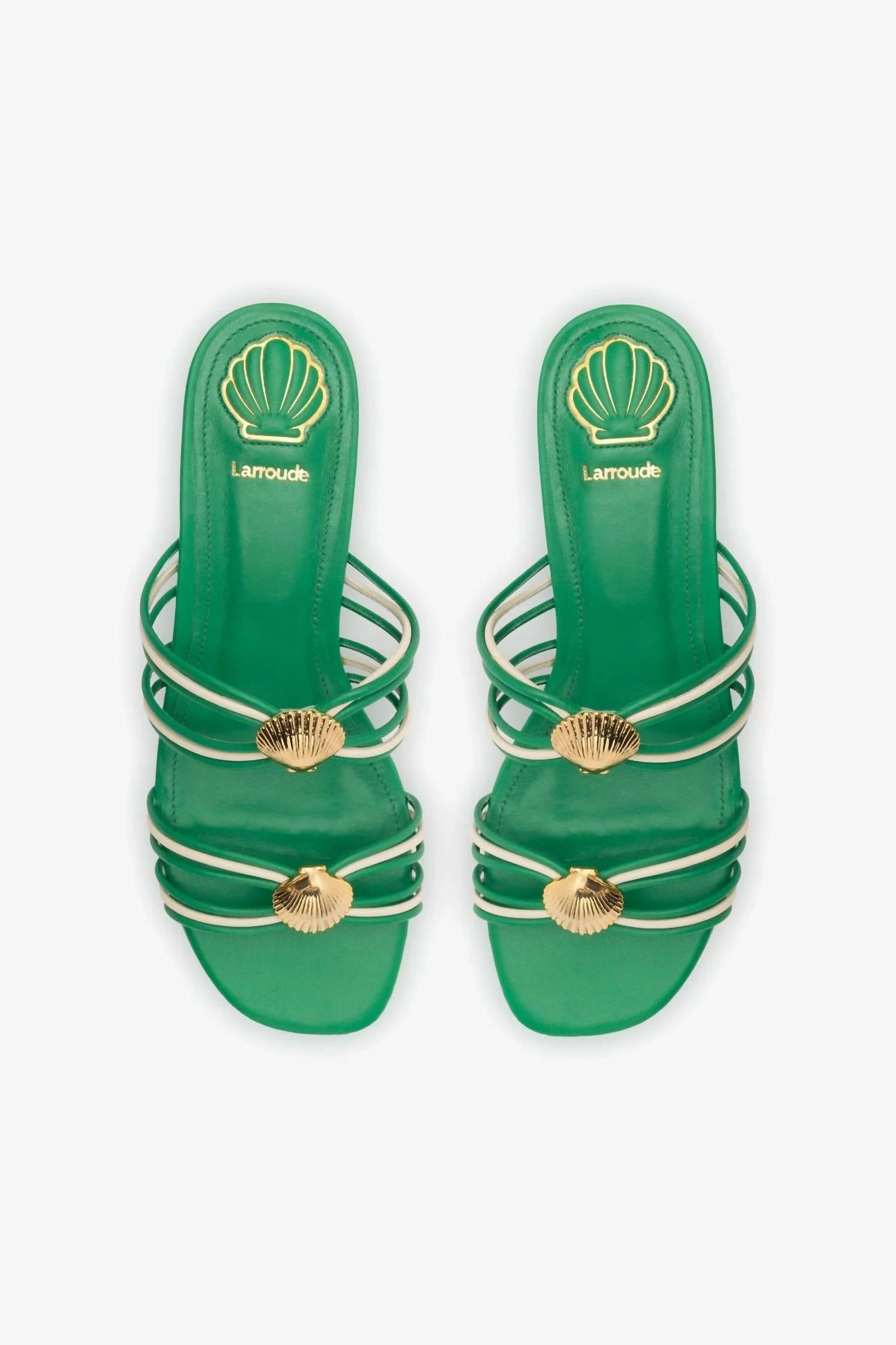 Step into summer with the Women's Shelly Flat Mule by Larroude, a charming piece in green perfect for beach days and beyond. Crafted from supple kid skin leather and handmade in Brazil, this mule showcases whimsical shell embellishments on the two front straps. It features a low 1.0-inch heel, golden hardware, and is designed for support, durability, and comfort with a finely crafted leather sole and an insole with memory foam cushioning. Remember to peel off the protector before first use to maintain its pristine condition.