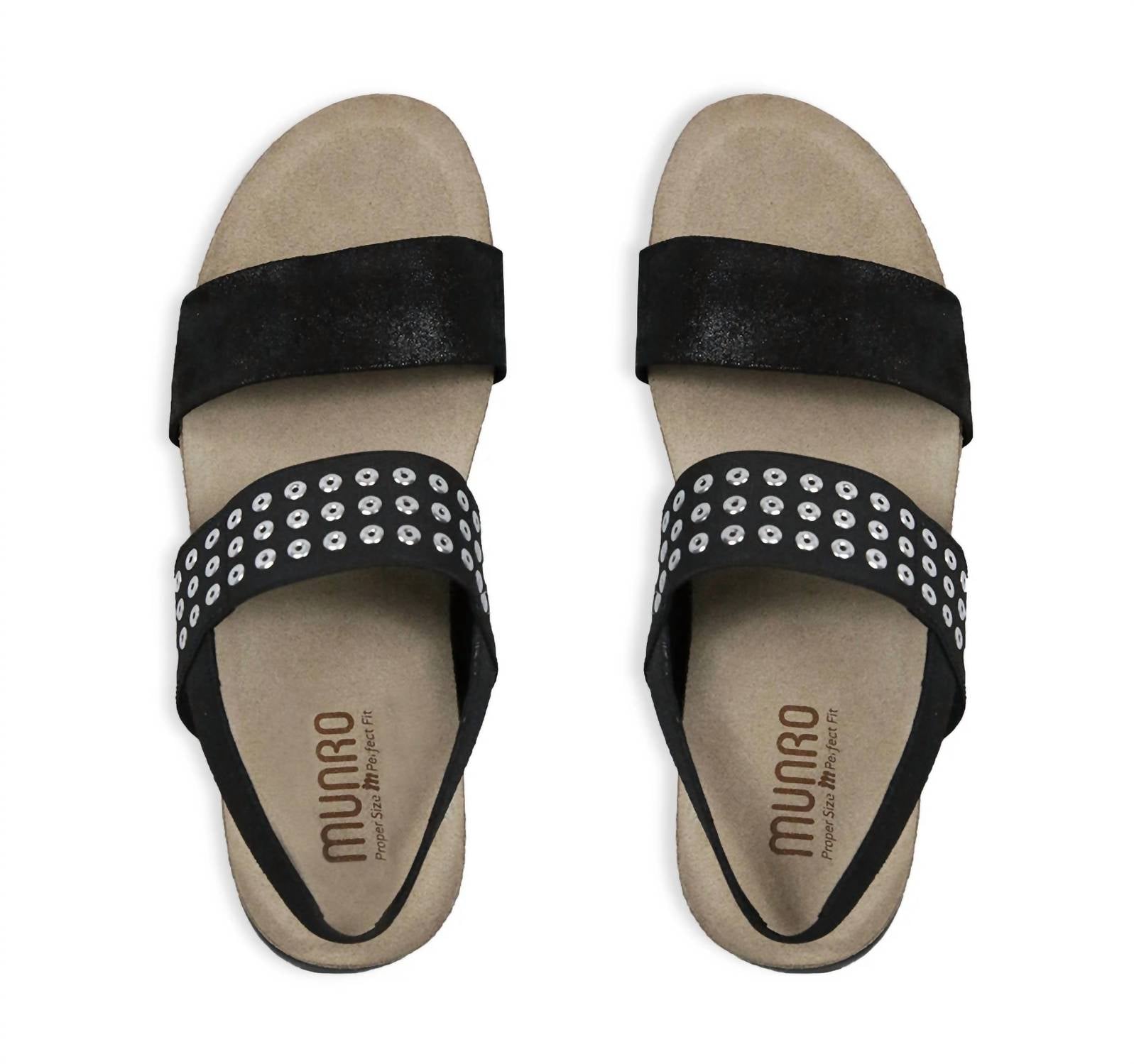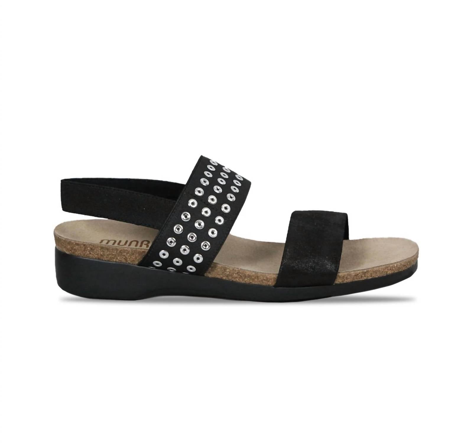 Step into comfort with the Women's Pisces Sandal by Munro, featuring a black nubuck strap adorned with metallic grommets on a popular footbed style. This sandal delivers a cushioned experience with its cork and latex wedge and a seamless fit thanks to the stretch fabric instep strap and nubuck vamp strap. The lining is crafted from microfiber, supported by an XL Extralight molded outsole for flexibility and shock absorption. Designed with a flat heel of 0.5 inches and an open toe shape, it's a perfect fit for medium-width feet.