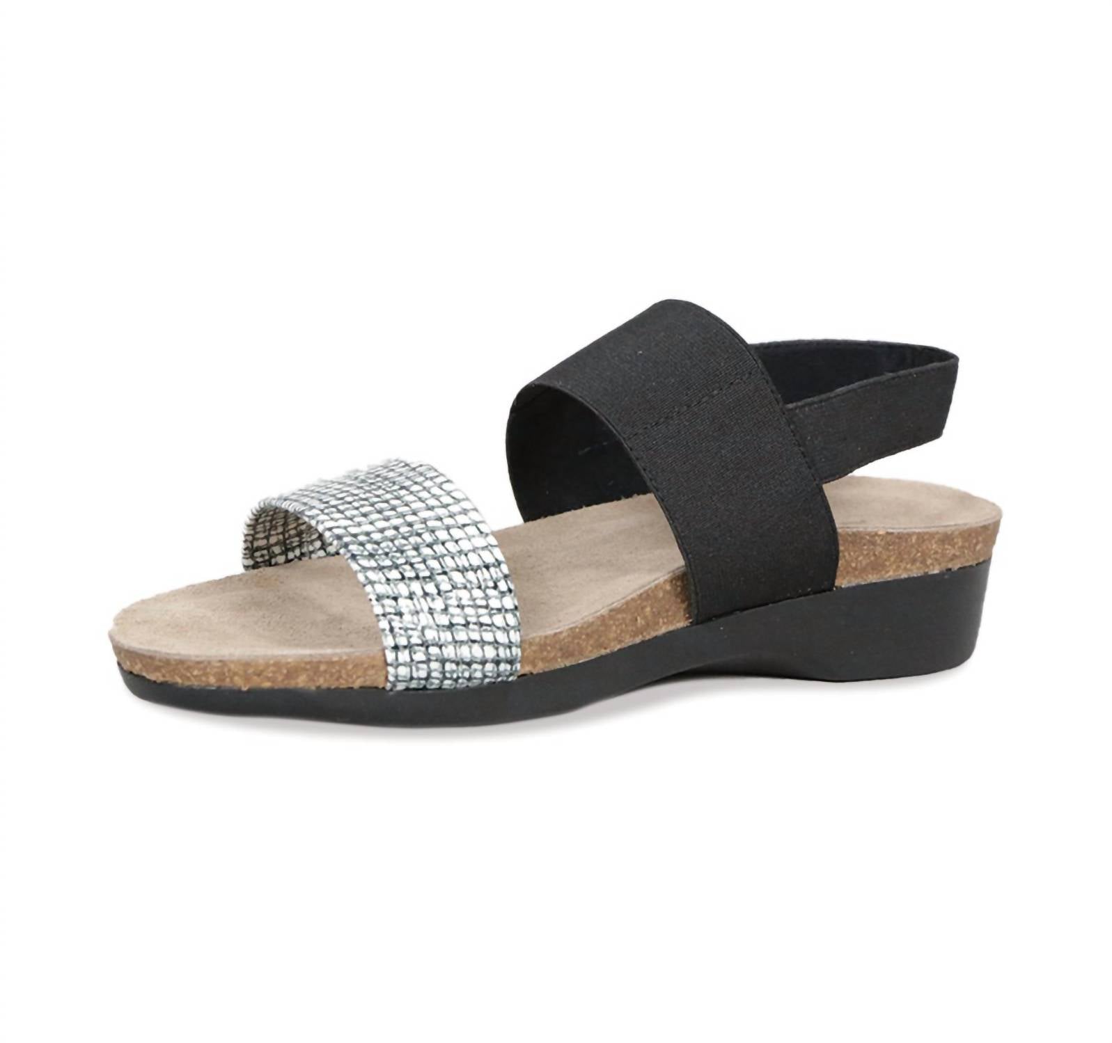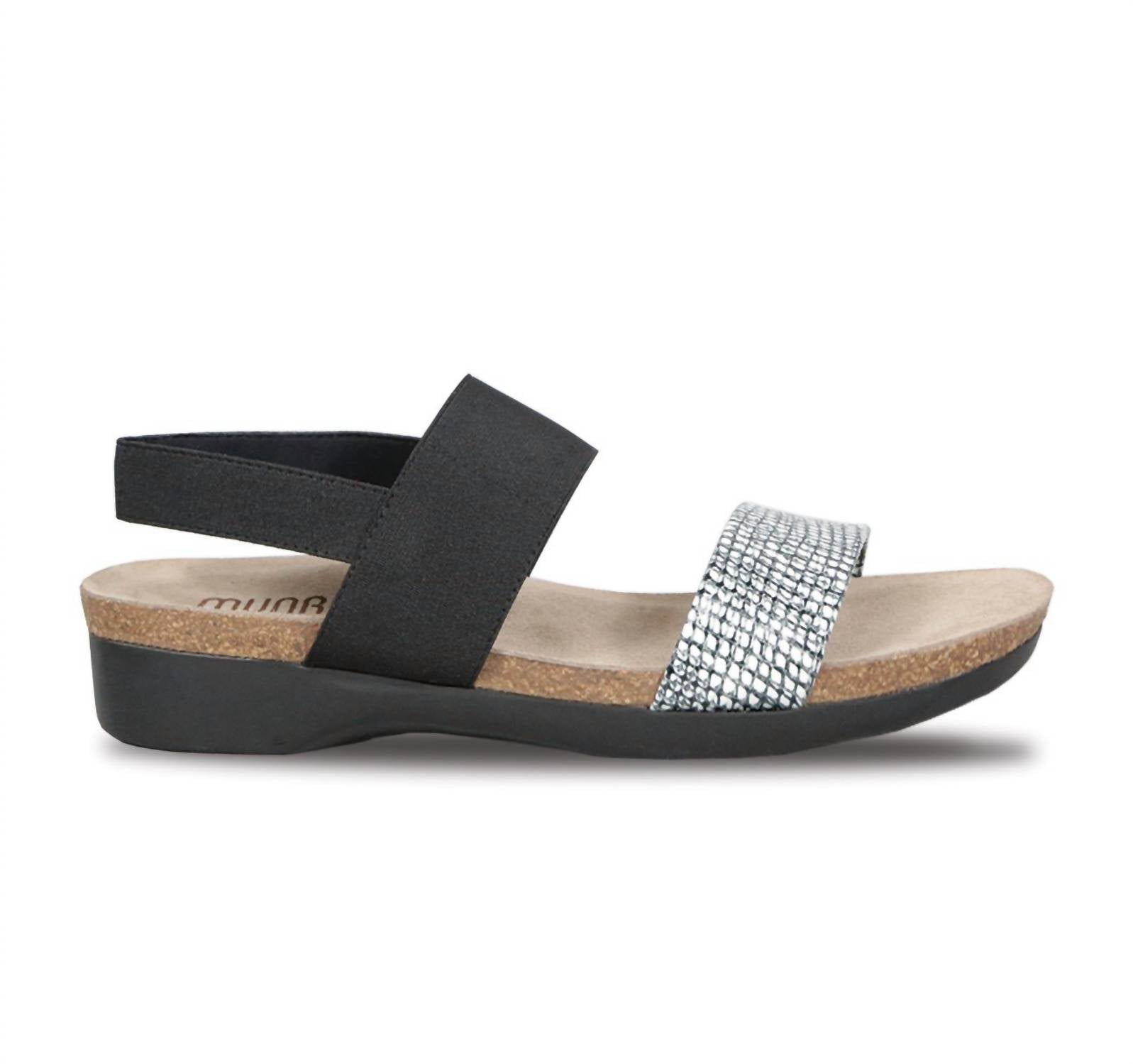 Step into comfort with the Women's Pisces Sandal by Munro, a stylish choice for summer vacations. Featuring a unique combination of a solid-black stretch fabric instep strap and a woven black and white pattern vamp strap, these sandals offer a chic open-toe design. They boast a contoured cork footbed made from sustainable cork sourced in Portugal, ensuring eco-conscious comfort. Made in the US with an XL Extralight outsole and microfiber lining, these sandals have a flat heel of 0.50 inches and require no break-in time, offering immediate comfort.