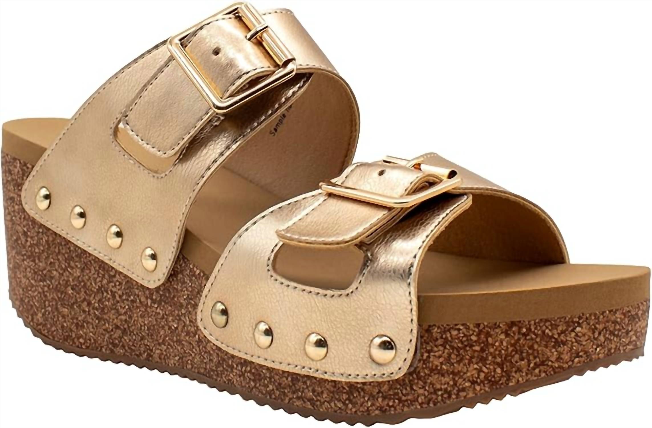 Step into summer vacation style with the Women's Gertrude Sandals by PV Footwear, designed in a shimmering gold hue. These slip-on sandals feature a faux upper with metal buckle and clog stud accents, balanced on a 2.25-inch cork wedge heel for a comfortable lift. The signature EVA insole and rubber outsole ensure durability and comfort, perfect for a day out. Composed with a round toe and ideal for casual occasions, these sandals are not water-resistant.