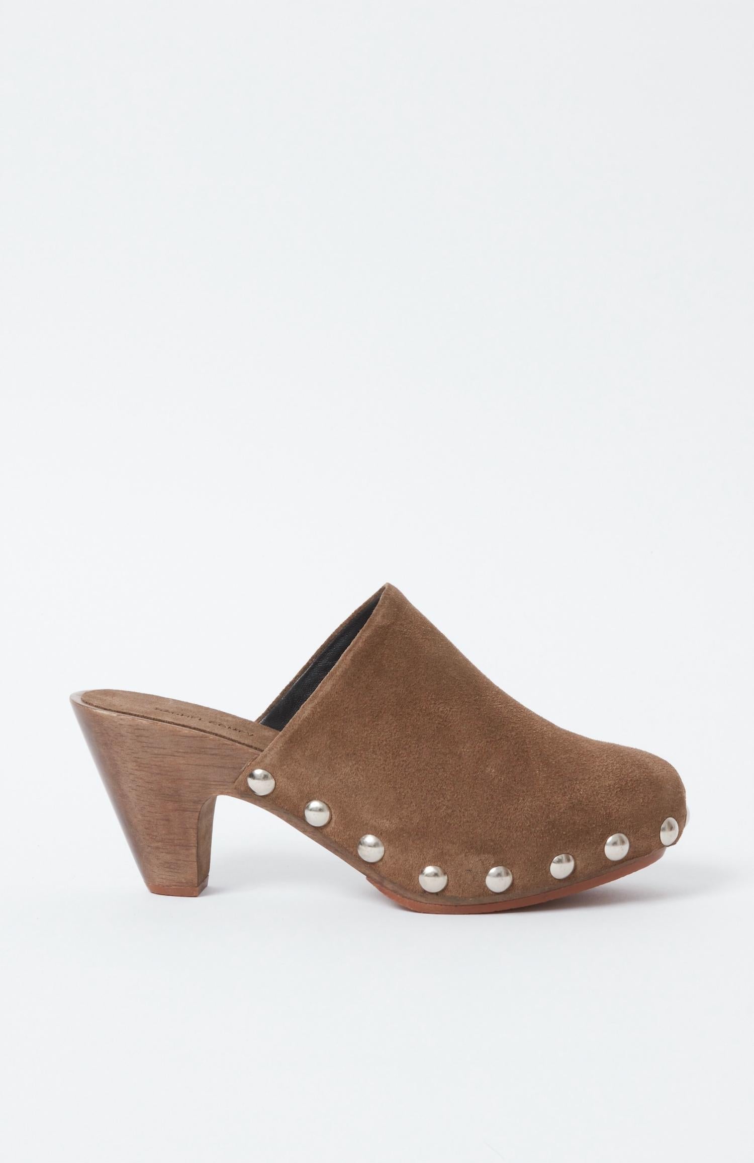 Step into timeless style with the Gyles Leather Clogs by Rachel Comey, a chic blend of traditional craftsmanship and contemporary flair in a unique seaweed hue. Featuring a suede closed-toe design, these clogs are elevated with a mid-height block heel and a sturdy wooden platform, accentuated by metal stud detailing for a touch of vintage charm. Made in Peru, these shoes boast a 75mm heel and a 30mm platform, ensuring comfort and style for any fall occasion. Composition: 100% Suede Leather, 100% Rubber Sole, 100% Wooden Platform.