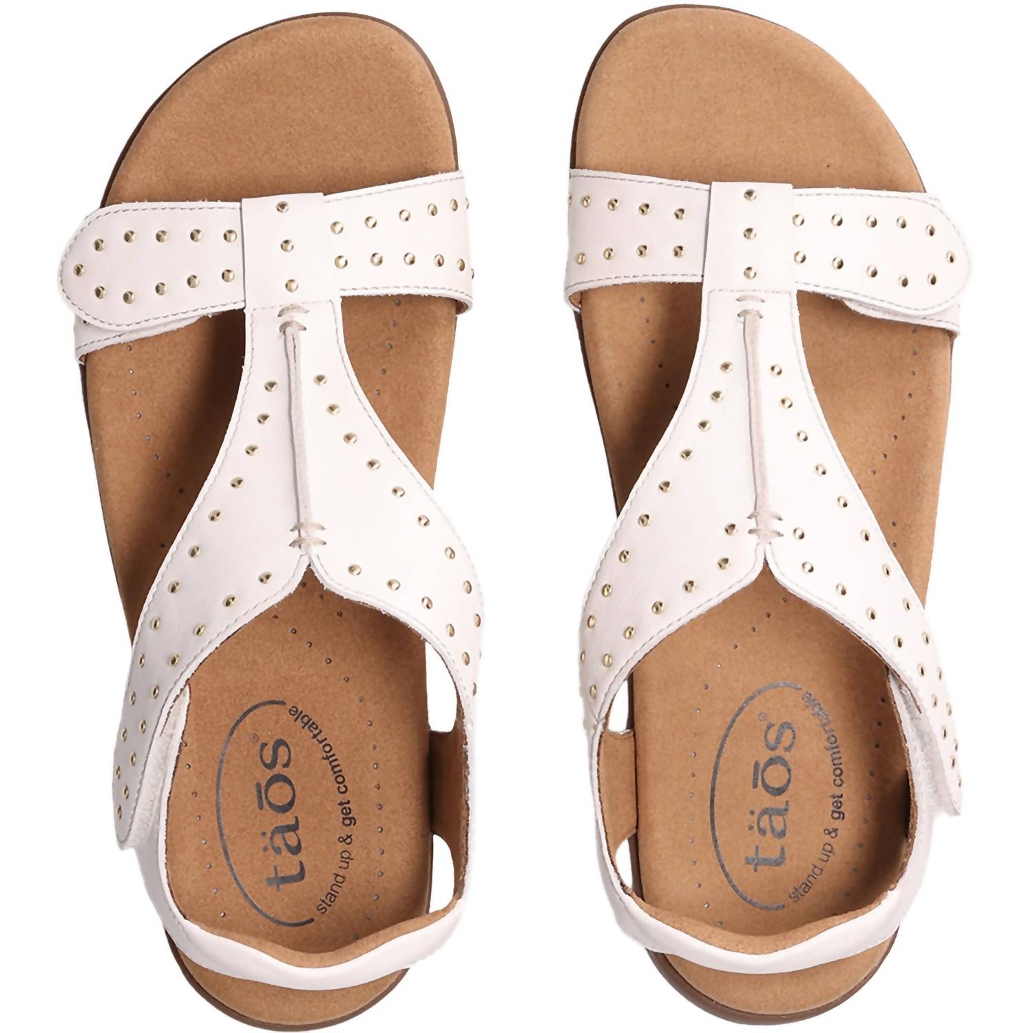 Step into summer with the Women's Show Stopper Sandal by Taos, designed to make an impact with its eye-catching gold mini stud detail and elegant shield-strap design. Featuring two adjustable hook-and-loop straps for a customizable fit, these white sandals boast an embossed leather upper and an antimicrobial microfiber footbed for exceptional comfort. The Cool Recovery Foam® ensures all-day cushioning and shock absorption, complemented by a flexible, durable rubber outsole. With a low heel height of 1 1/4" to 2", this sandal is perfect for a vacation-ready, minimalist look.