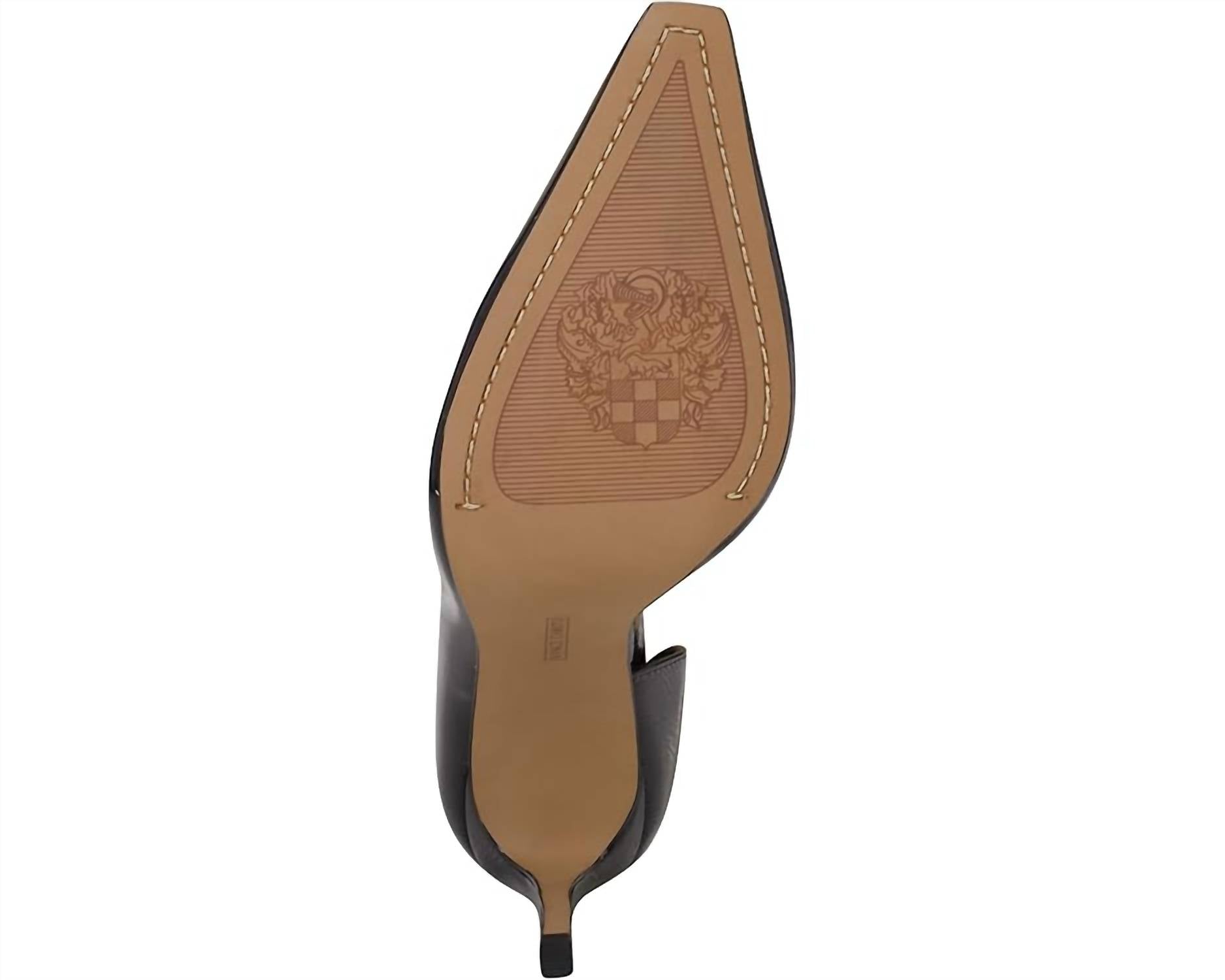 The Emelia d’Orsay pump brings instant glamour with its sleek pointed-toe silhouette and covered stiletto heel. A rectangular pavé jeweled ornament adds sparkle, while a cushioned comfort sock ensures ease from day to night. Crafted with a leather upper, polyester lining, rubber insole, and a durable rubber outsole, this slip-on style blends elegance with lasting wearability.