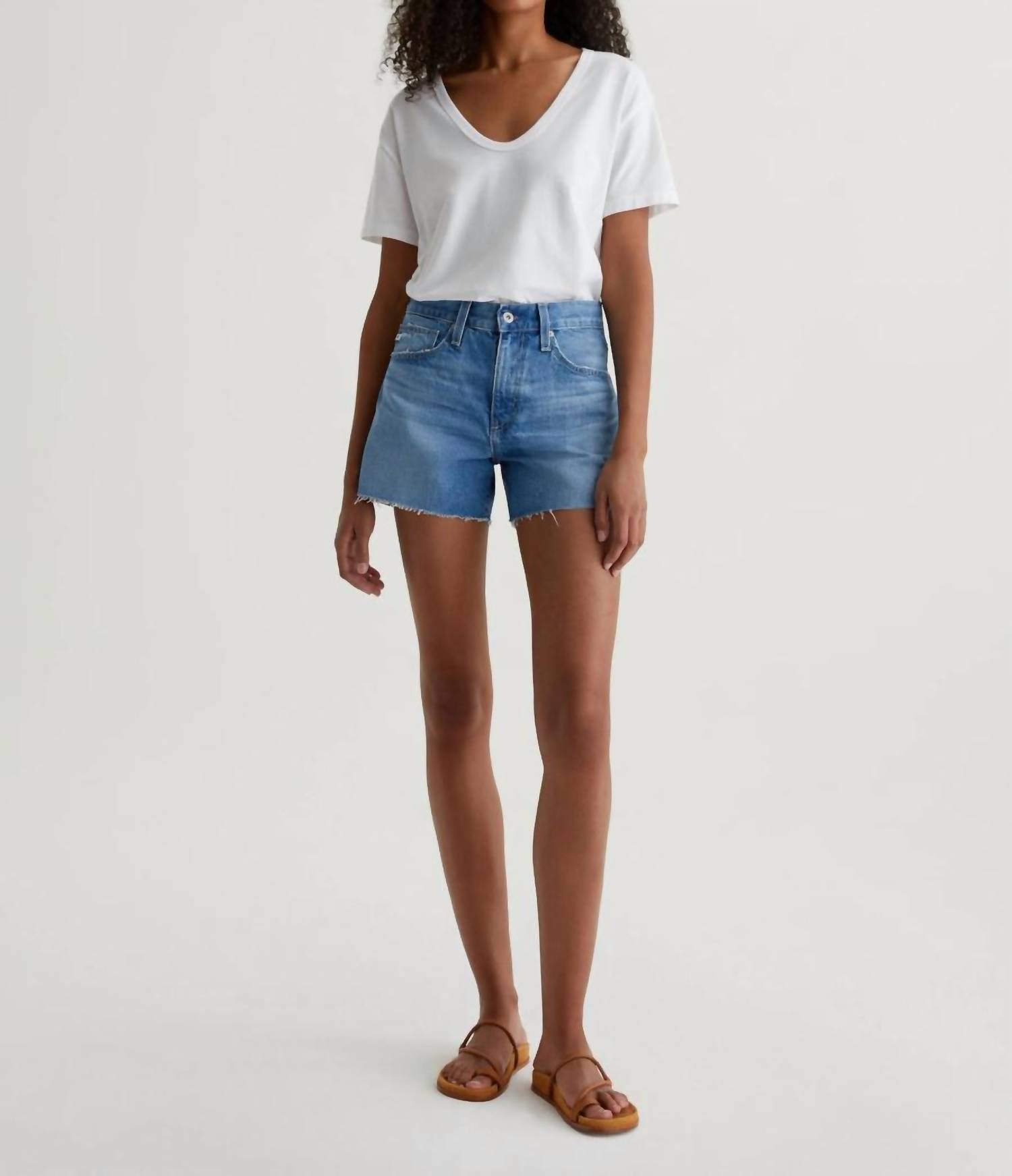 Jean shorts so versatile, you can literally wear them with anything. Introducing the Halle Jean Short by AG Jeans, a stylish piece perfect for a relaxed outing. These high-rise cutoff shorts offer an easy fit through the hips, crafted from a durable 12 oz. Drapey Rigid Denim featuring a brilliant blue wash with raw hems. Composition: 82% Cotton, 18% Lyocell. Closure: Button closure. Care: Machine wash cold. Made in the USA. Designed for comfort and true to size, with precise dimensions: Front Rise 10 3/4", Bottom Opening 24", and Inseam 4".