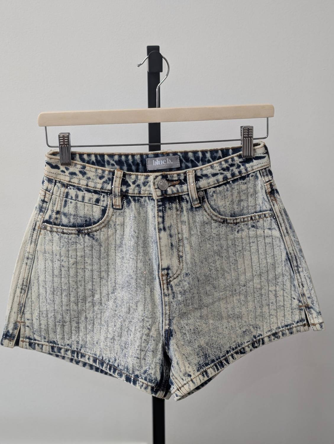 Not only cute but extremely comfortable. The jean shorts you will be reaching for all season long. Embrace the festive spirit with the Crystal Embellished Acid Wash Shorts by Blue B, perfect for adding sparkle to any occasion. These stylish denim shorts feature a textured pattern with side slits, ideal for festival season and more. Designed with convenient pockets and a secure zip closure, they combine fashion with function. These trendy shorts are a must-have for streetwear enthusiasts.