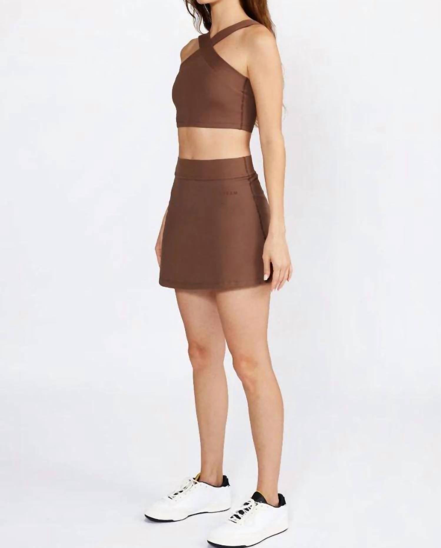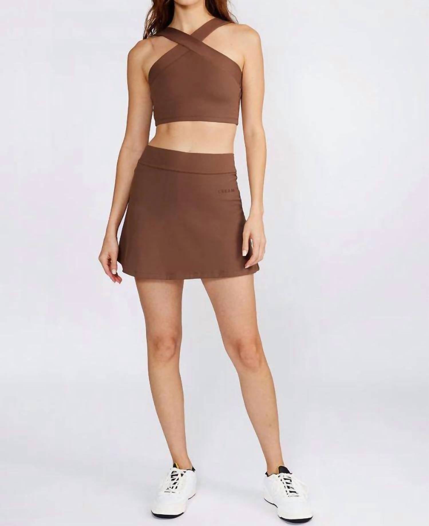 A skirt that you can do just about anything in? We love a good skort, especially this one! Elevate your activewear collection with the Evelyn Skort by Cream Yoga, a perfect blend of functionality and style in a chic mocha shade. Designed with a smooth pull-on closure, this skort features a tennis-inspired look complemented by built-in pocket biker shorts for added convenience. Crafted from a 75% Nylon and 25% Spandex composition, it offers medium support for all your fitness and streetwear needs. Ideal for summer athleisure outfits, this skort stands out with its solid pattern and practical design.