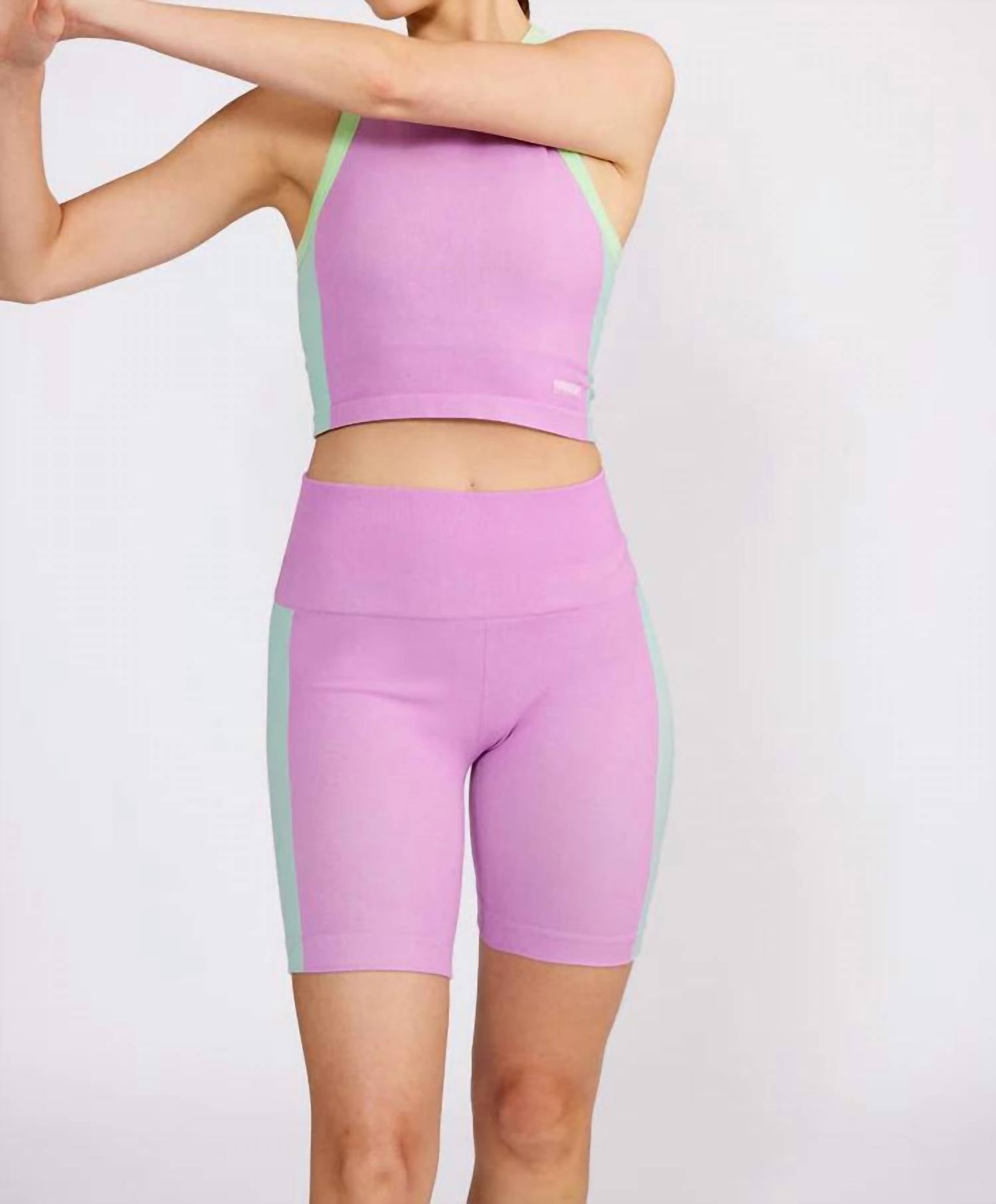 Bike shorts you don't even need a bike for! We are here for the bike short trend. These seamless biker shorts offer a soft, creamy touch with a ribbed texture and stylish two-tone contrast side color block. Designed with a high-rise, double-layered waistband for support and a 6" inseam for versatile wear, they provide medium support—ideal for mid-impact workouts or everyday comfort. Pair with the matching Mia tank bra for a coordinated set. Composition: 34% Nylon, 33% Viscose, 27% Polyester, 6% Elastane.