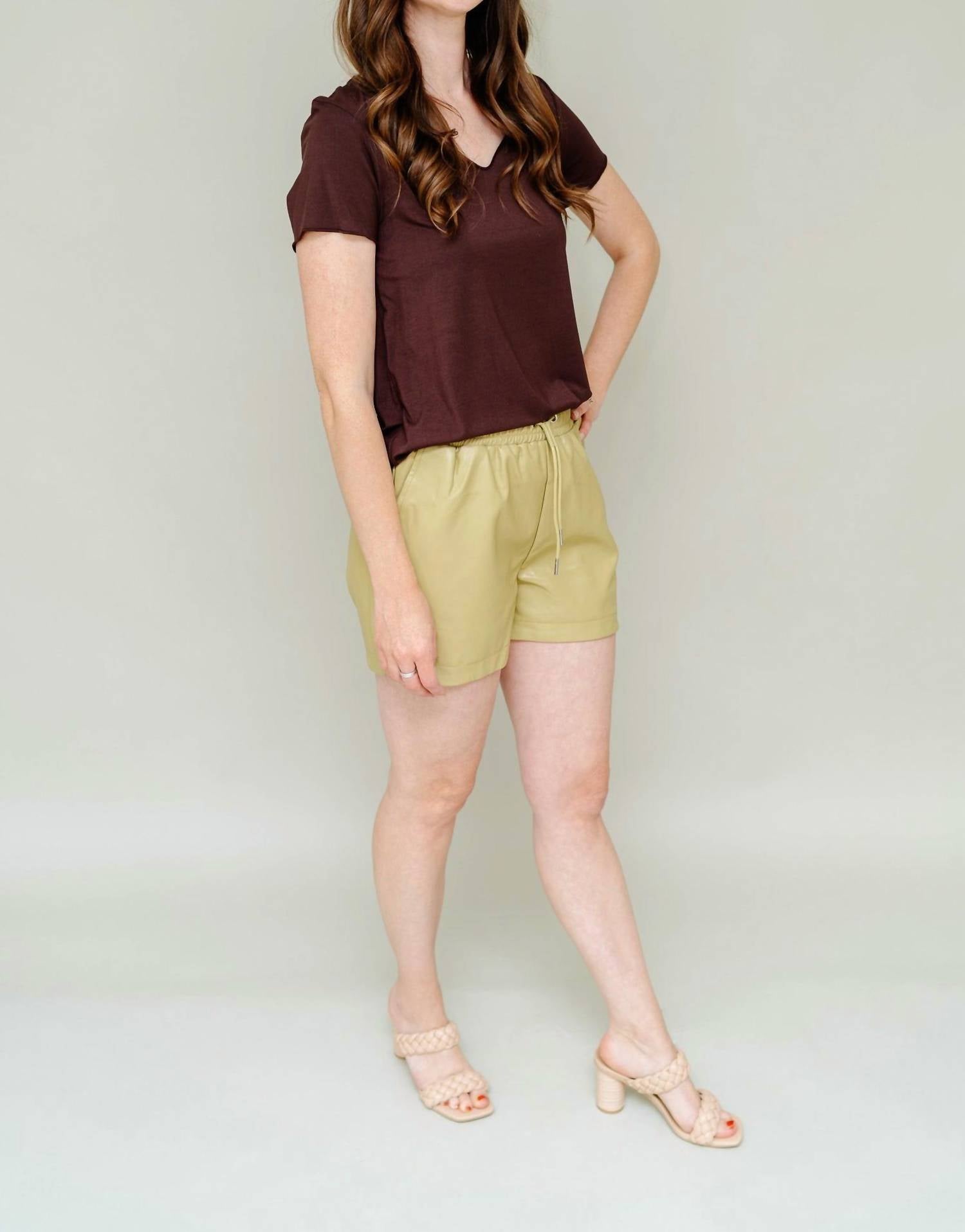 Tuck your favorite tee into these high-waist shorts for a more casual-cool feel. Elevate your summer wardrobe with the Lindsay Faux Leather Shorts by CRST, a chic choice in Pistachio that's perfect for vacation styling. Crafted from a cotton blend of 50% Cotton and 50% PU, these shorts feature a pull-on design with an elasticized waistband and adjustable drawstring for a comfortable fit. The design is complete with a curved hem and practical front pockets. Care for these solid, high-waisted shorts with a dry clean only approach. Model is wearing a size S (5'6" height).