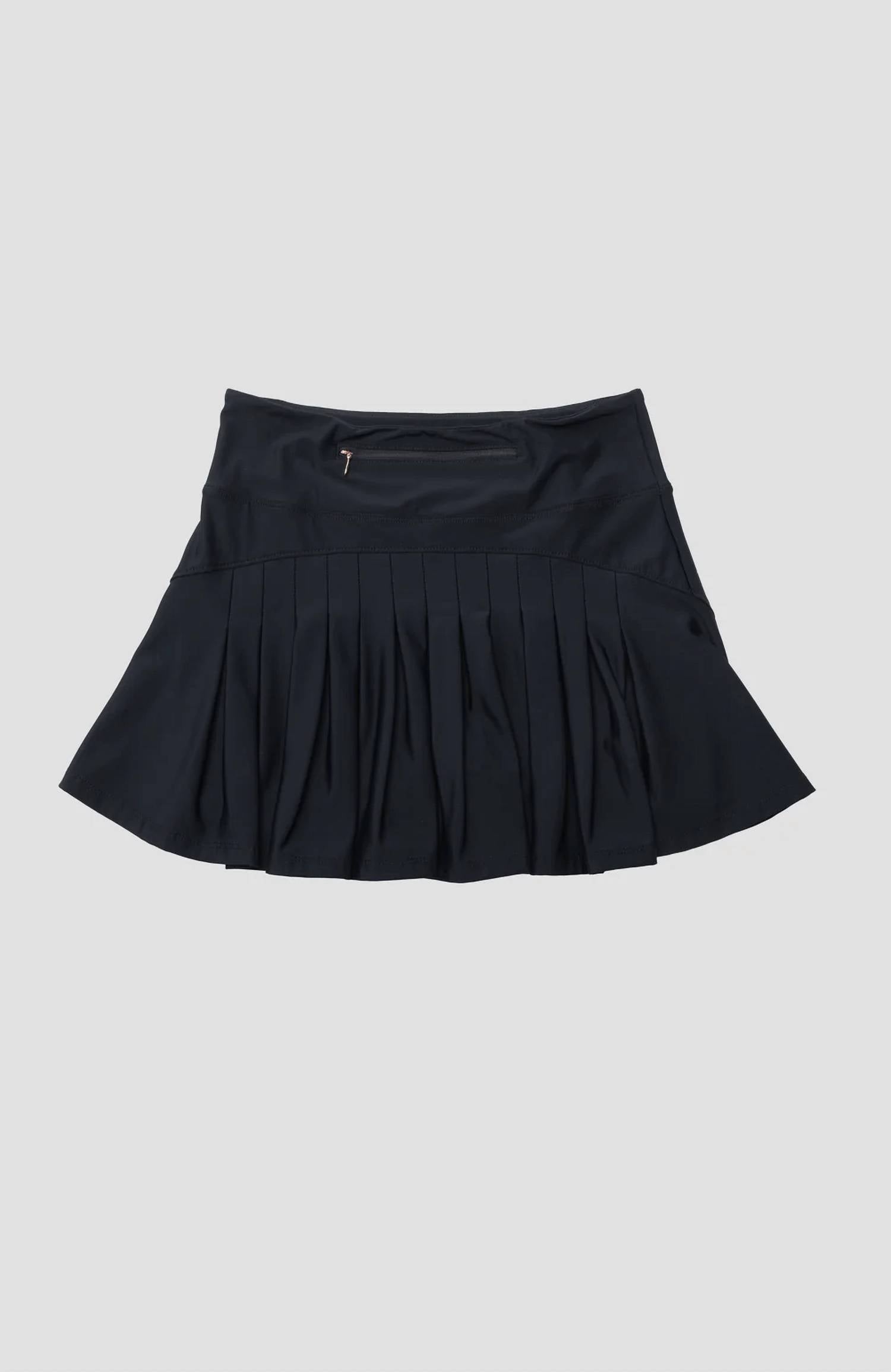 A skirt that you can do just about anything in? We love a good skort, especially this one! Enhance your athletic endeavors featuring flattering and flirty back pleats. With a comfortable mid-rise fit, offers practical side pockets in the built-in shorts and a hidden pocket at the back waist, while the signature rose gold lip pin adds a touch of elegance. Made in US with Italian fabric. Consists of 78% recycled polyester and 22% elastane, allowing for ease of movement. Pull on style. Machine wash warm, lay flat to dry. Ideal for summer athleisure and perfect for sports like golf, pickleball, and tennis.