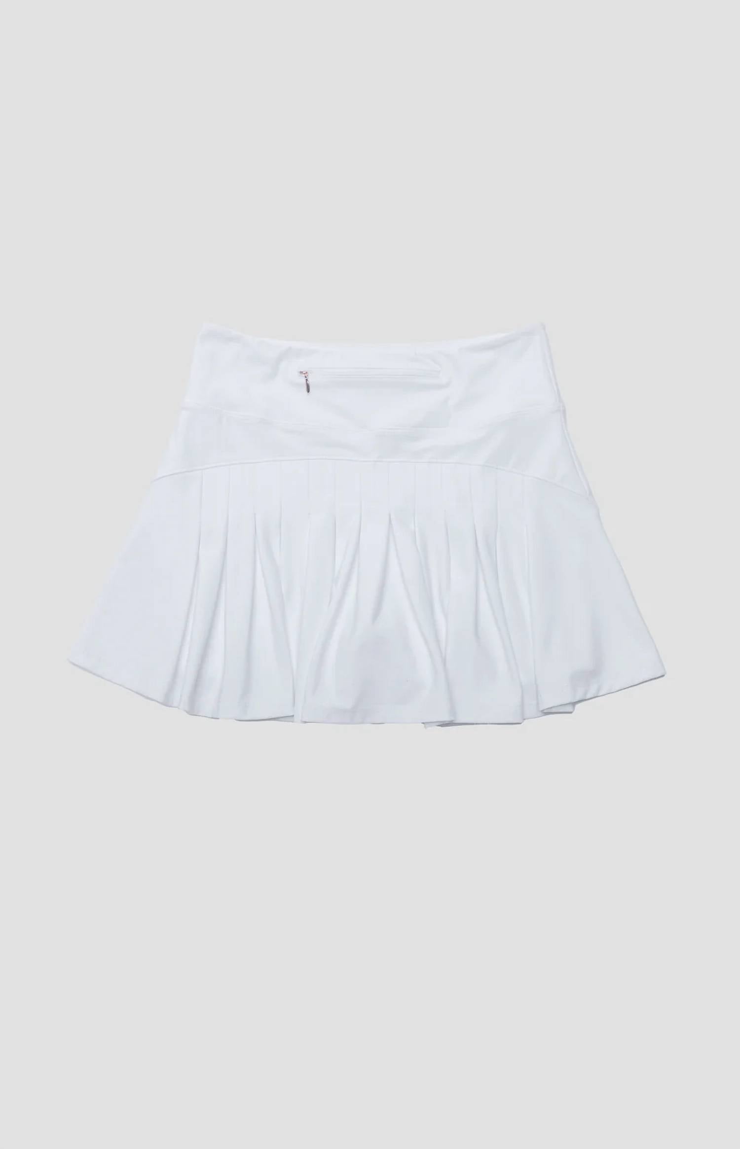 The go-anywhere and do-anything skort that you'll love to live in. Enhance your athletic endeavors featuring flattering and flirty back pleats. With a comfortable mid-rise fit, offers practical side pockets in the built-in shorts and a hidden pocket at the back waist, while the signature rose gold lip pin adds a touch of elegance. Made in US with Italian fabric. Consists of 78% recycled polyester and 22% elastane, allowing for ease of movement. Pull on style. Machine wash warm, lay flat to dry. Ideal for summer athleisure and perfect for sports like golf, pickleball, and tennis.
