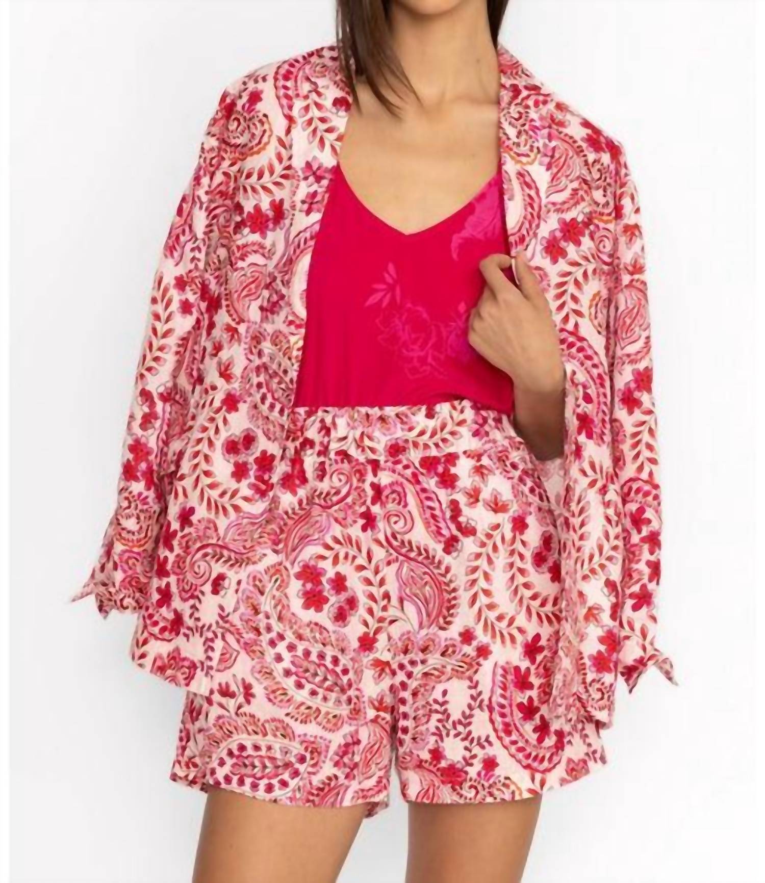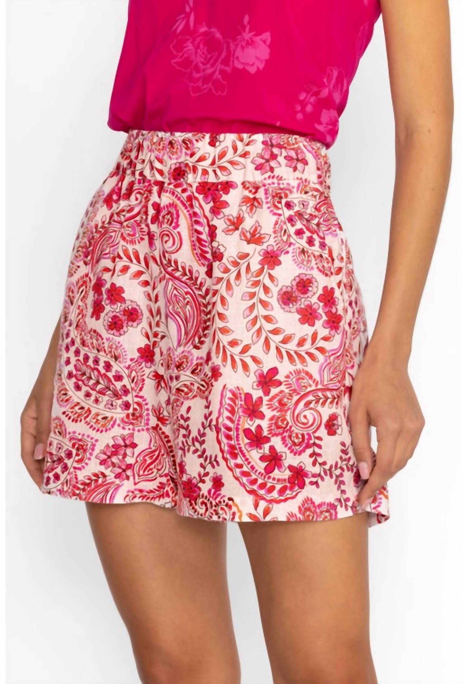 The go-anywhere and do-anything skort that you'll love to live in. The Lillet Shorts are made from 100% breathable linen and are ideal for hot summer days. They feature a comfortable elastic waistband and functional slip pockets. These vibrant shorts showcase a bold, colorful pattern. Pair them with a matching tank top and a white linen button-down shirt for a vacation-ready outfit. 100% Linen Machine Wash