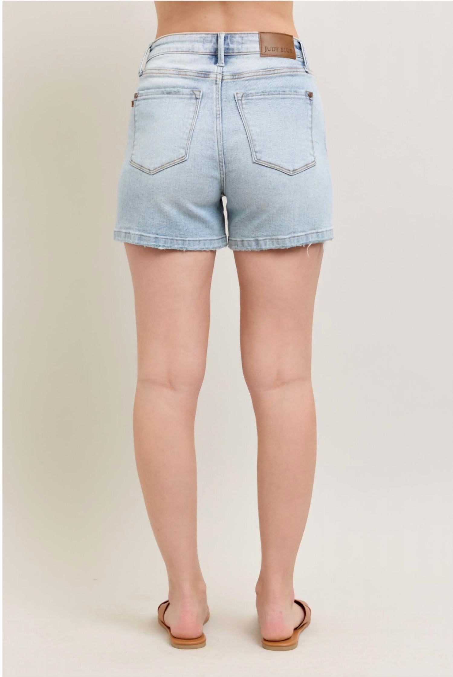 Elevate your spring streetwear collection with the Judy Blue Rigid Magic Shorts in Light Wash, perfect for concerts and casual outings alike. These women's high-waisted shorts feature a solid pattern and a classic button closure for a timeless look. Crafted from Judy Blue’s signature stretchy and soft denim, they provide a flattering fit with an 11 1/4" rise and 4 1/2" inseam for regular sizes, and a 12 3/4" rise and 5 3/4" inseam for plus sizes. The shorts include pockets for added convenience, a nod to both style and functionality.