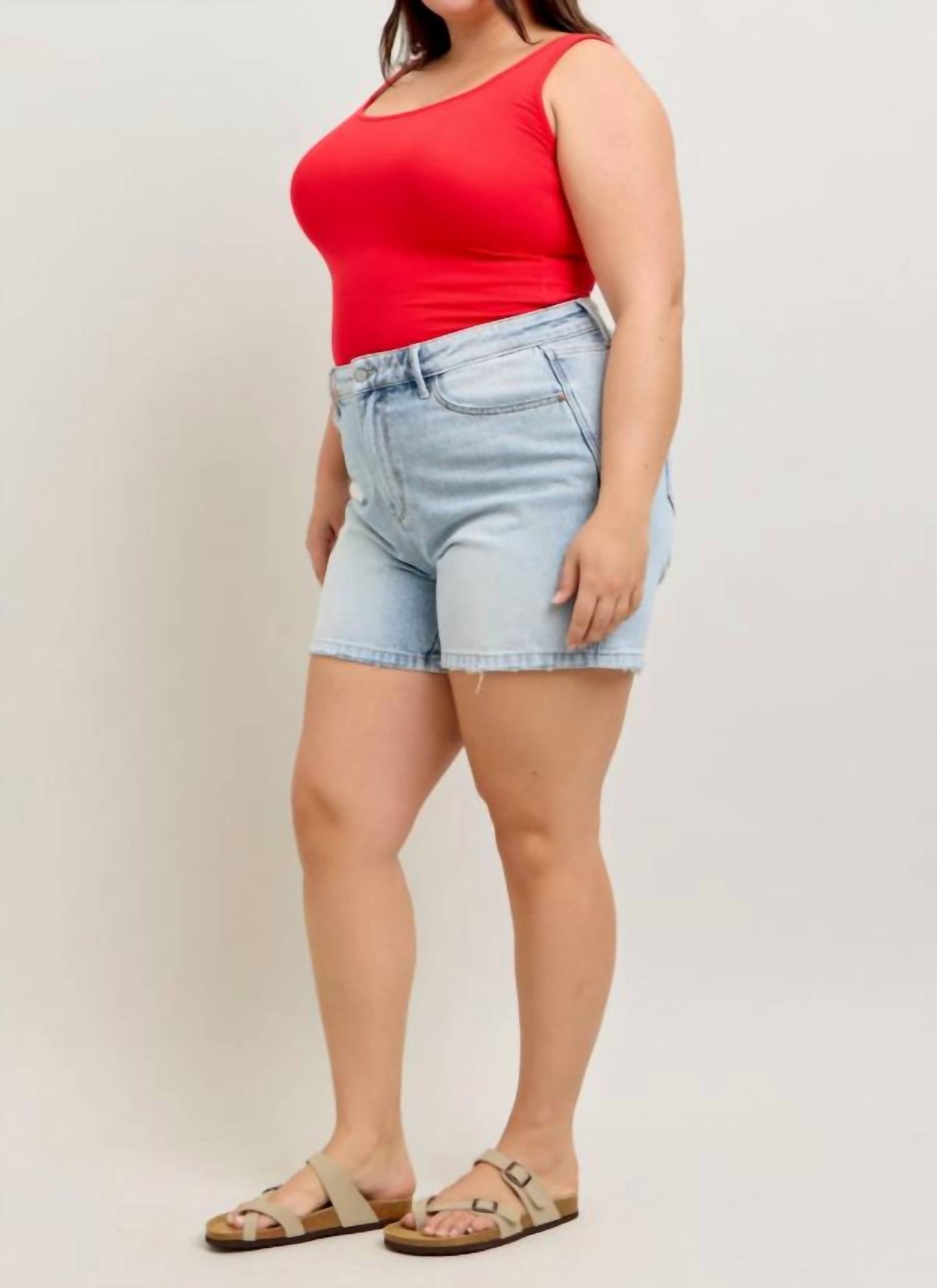Tuck your favorite tee into these high-waist shorts for a more casual-cool feel. Elevate your spring streetwear collection with the Judy Blue Rigid Magic Shorts in Light Wash, perfect for concerts and casual outings alike. These women's high-waisted shorts feature a solid pattern and a classic button closure for a timeless look. Crafted from Judy Blue’s signature stretchy and soft denim, they provide a flattering fit with an 11 1/4" rise and 4 1/2" inseam for regular sizes, and a 12 3/4" rise and 5 3/4" inseam for plus sizes. The shorts include pockets for added convenience, a nod to both style and functionality.