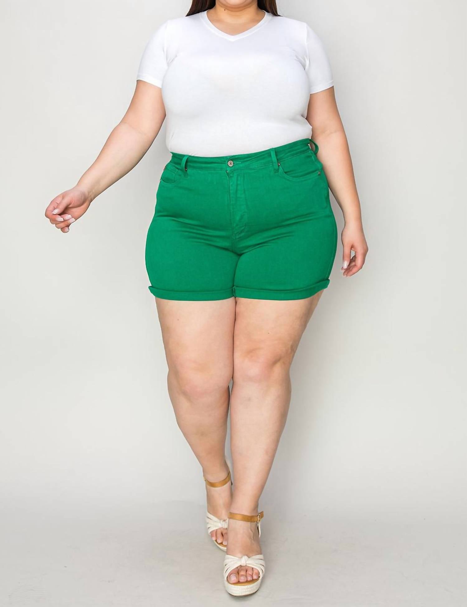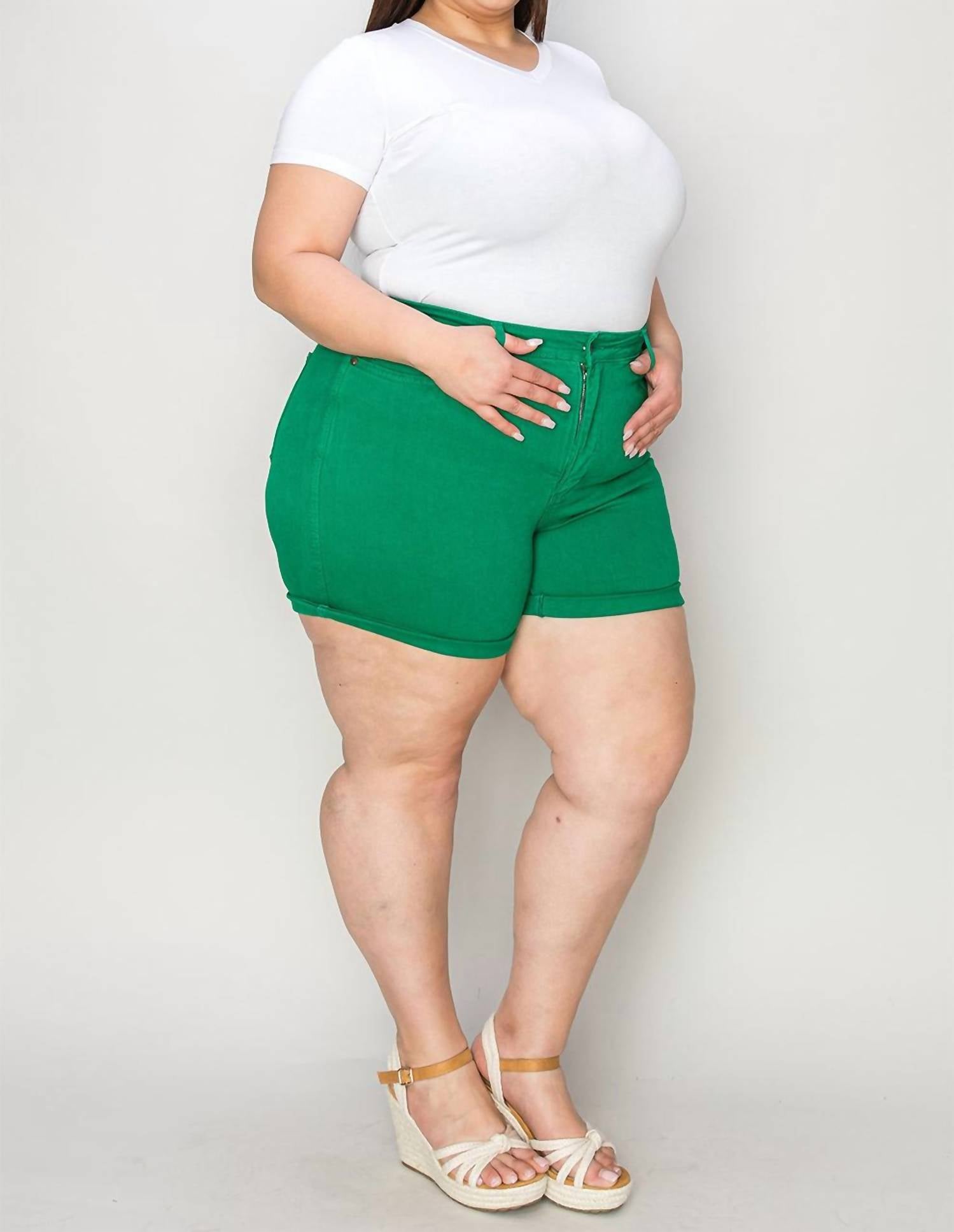 Not only cute but extremely comfortable. The jean shorts you will be reaching for all season long. Enhance your summer wardrobe with the Tummy Control Garment Dyed Denim Shorts by Judy Blue, expertly crafted for a flattering fit. These green shorts feature moderate stretch for comfort and are made from a cotton blend, consisting of 93% cotton, 6% polyester, and 1% spandex. They come with a convenient button closure and are imported for versatile wear. Care for these textured jean shorts the easy way with machine wash cold and tumble dry low instructions. Designed with tummy control technology, these plus-size shorts are perfect for showcasing your curves during beach days.
