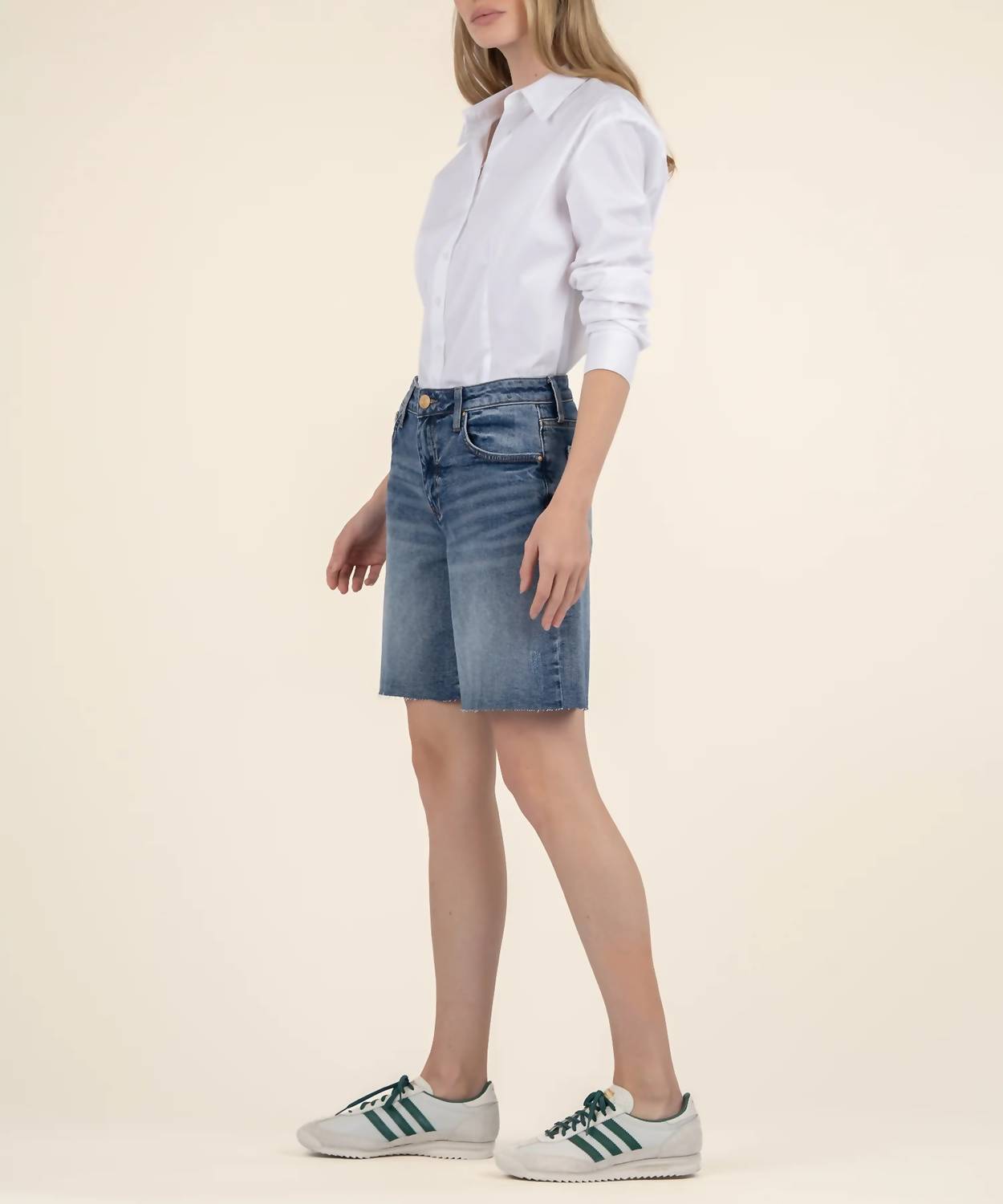 You can never have too many jean shorts and these will be your new favorites. Introducing the Hailey High Rise Bermuda Shorts by KUT FROM THE KLOTH, crafted from a comfortable cotton blend offering a textured feel. These stylish shorts feature a high-rise design with a dark base wash, raw hem, and an inseam of 8 inches, perfect for adding an edgy, contemporary vibe to your wardrobe. With a convenient button closure and pockets, these are chic for relaxed days. Composition: 99% Cotton, 1% Spandex. Care: Machine wash cold inside out with like colors and tumble dry on low, or lay flat to dry for better care.