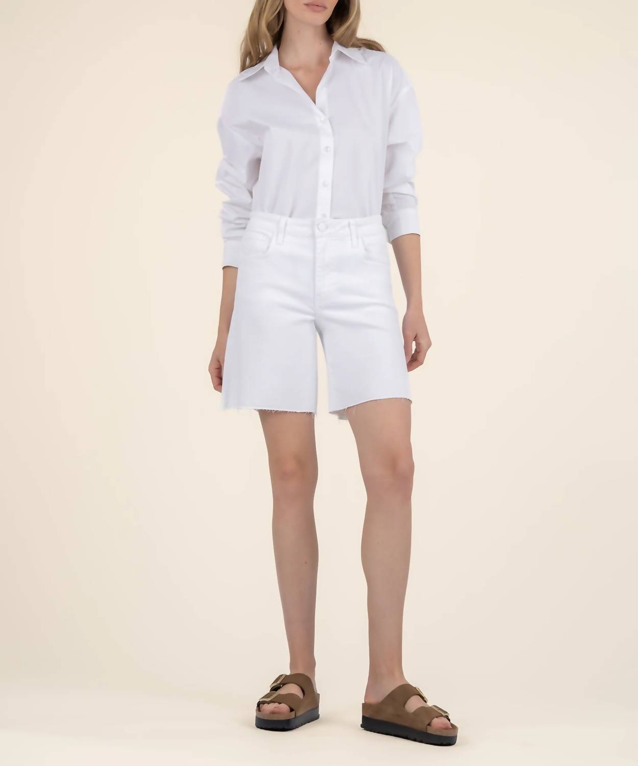 You can never have too many jean shorts and these will be your new favorites. Elevate your summer style with the Hailey High Rise Bermuda Shorts by KUT FROM THE KLOTH, crafted from a comfortable 97% Cotton and 3% Spandex blend. These women's shorts, in striking optic white, feature an 8-inch inseam and a raw hem, offering an edgy yet relaxed vibe. With a button closure and thoughtful design details like textured fabric and functional pockets, they are perfect for casual chic days. Care is easy: simply machine wash cold inside out and tumble dry low, ensuring these Bermuda shorts remain a staple in your wardrobe.
