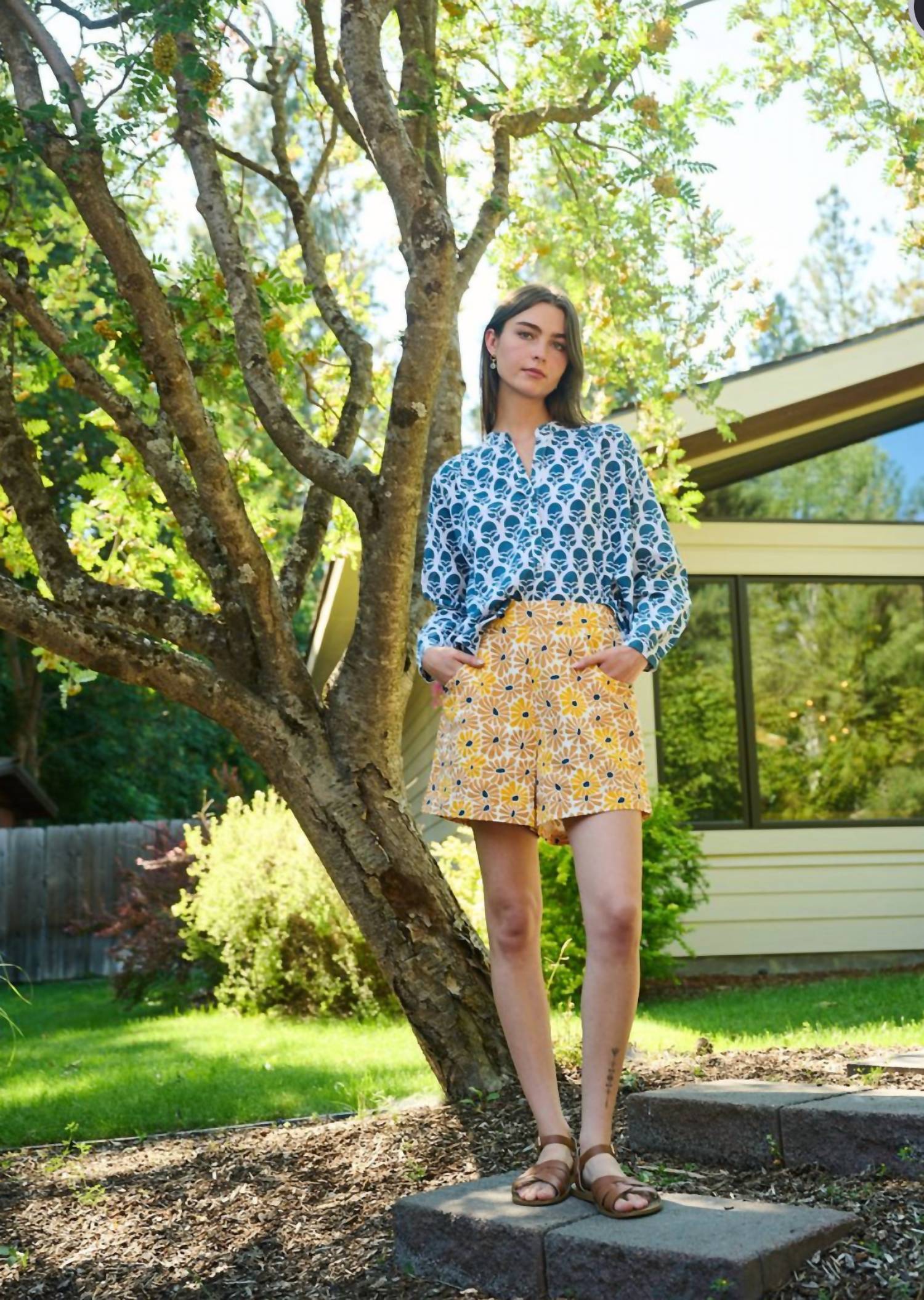 High-waist is here to stay and we especially love this style short. Meet the Sunny Shorts by Mata Traders, a stylish option for any spring outing, particularly suited for Easter or holiday parties. These high-waist shorts are crafted from structured yet comfortable 100% cotton twill in a vibrant yellow with a unique graphic pattern. Featuring an approximate 4" inseam, pockets, a cuffed hem, and a hidden side zipper and fabric-covered button closure, these shorts ensure both comfort and style with their elasticated back waistband and flat front. Made fair trade in India, they offer the perfect blend of fashion and ethics. Care is easy with machine washing and line drying recommended.