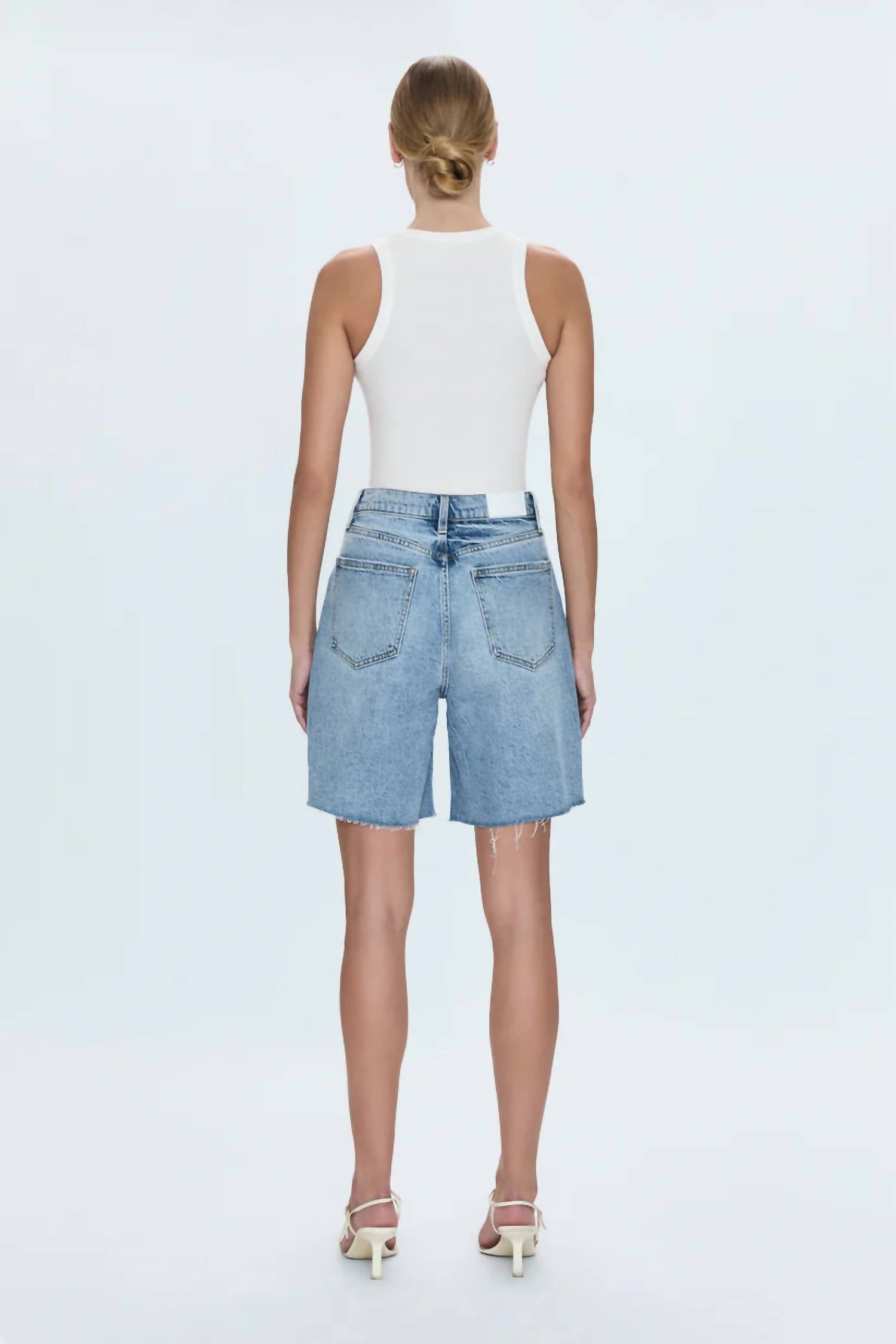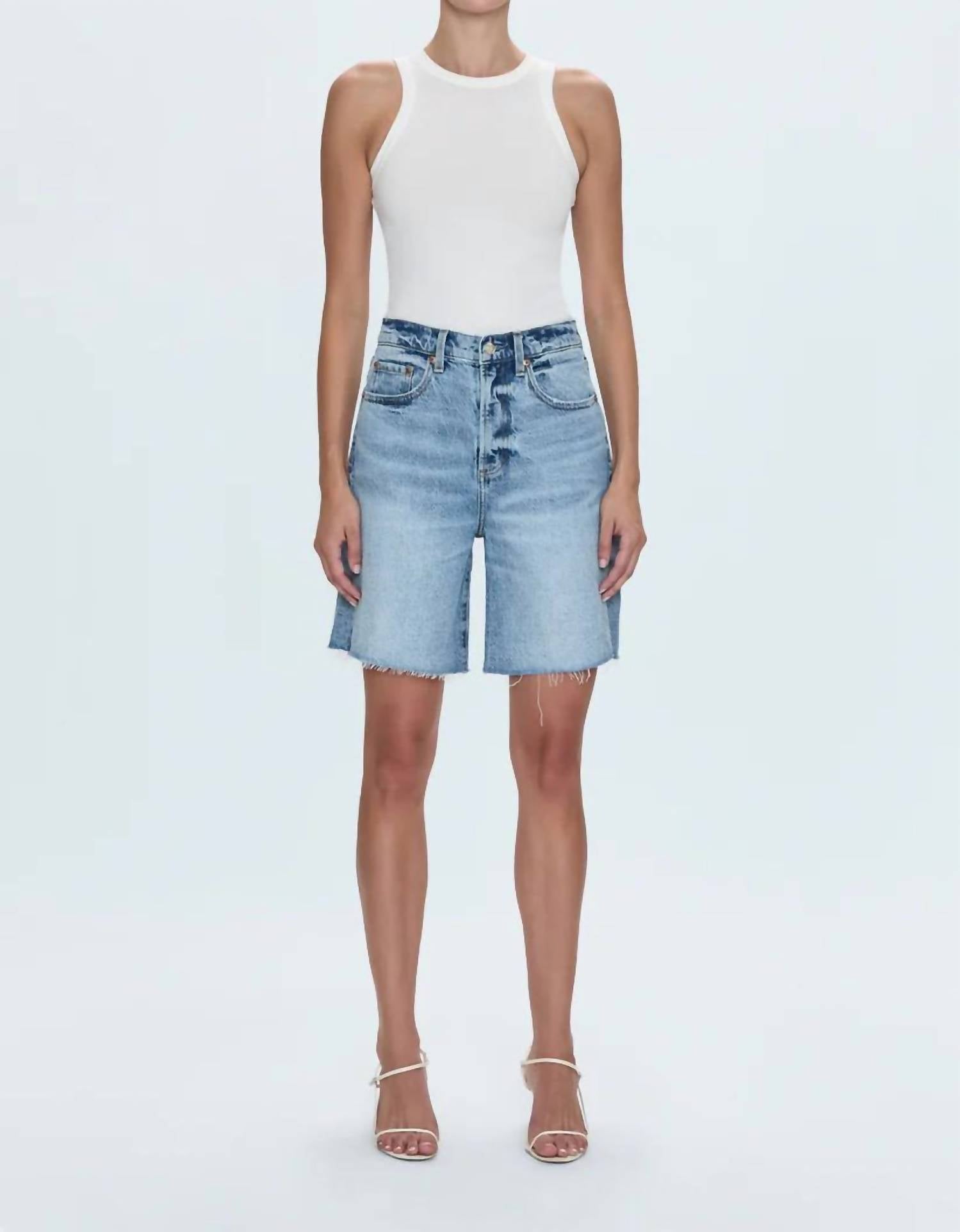 Jean shorts so versatile, you can literally wear them with anything. Introducing the Kaylee High Rise Pinched Loose Short by PISTOLA, your perfect summer staple. Crafted from a comfortable cotton blend, these jean shorts feature a high rise and pinched waist that flatter the figure, while the long length and loose fit provide a laid-back feel. The light blue Boulder wash showcases vintage-inspired fading and a frayed hem for added style. Designed with a button closure and functional pockets, these shorts can be machine washed and tumble dried for easy care.